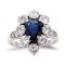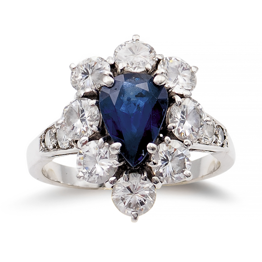 Anello in oro bianco 18kt con zaffiro a gocciaanni 40/50peso 5,3 gr.ct 0,80 circa contornato da diamanti taglio brillante ct 1 circa, misura 7