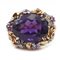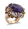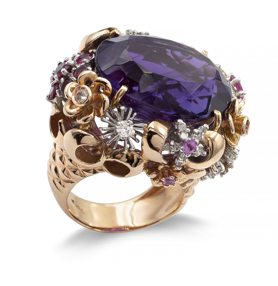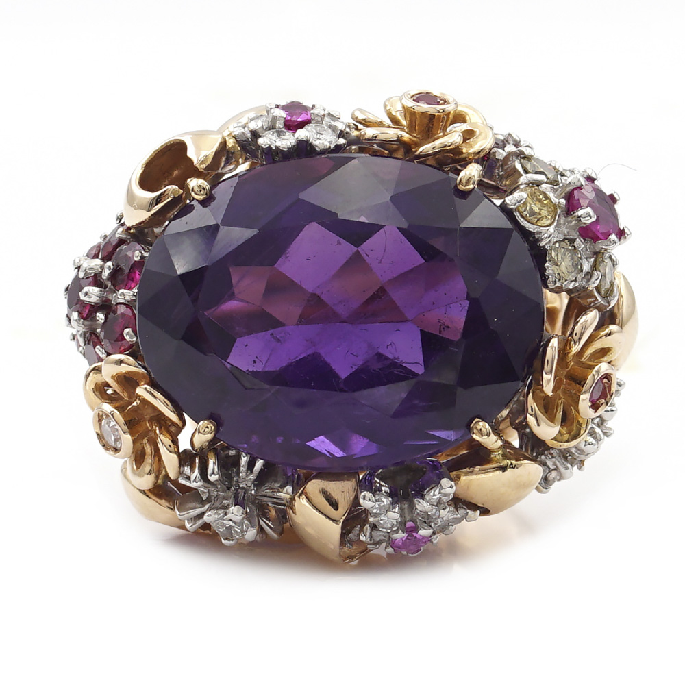 Anello a motivo floreale in oro giallo 18kt con ametistapeso 35,5 gr.taglio ovale brillante, contornata da fiori realizzati in oro giallo e bianco con rubini tondi e diamanti taglio brillante e fancy color ct 1,20 circa, misura 15