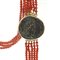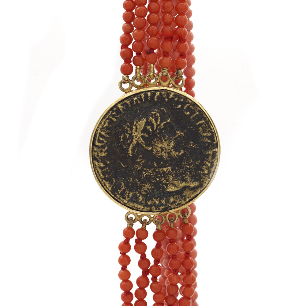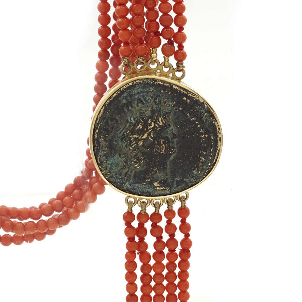 Collana a cinque fili di sfere in corallo rossopeso 127 gr.impreziosita da due medaglie antiche in bronzo raffiguranti Nerone e Traiano montate su oro giallo 18kt, lunghezza 84 cm.