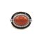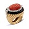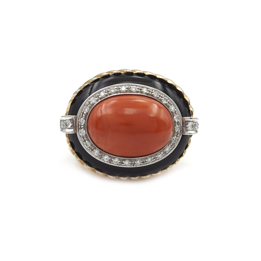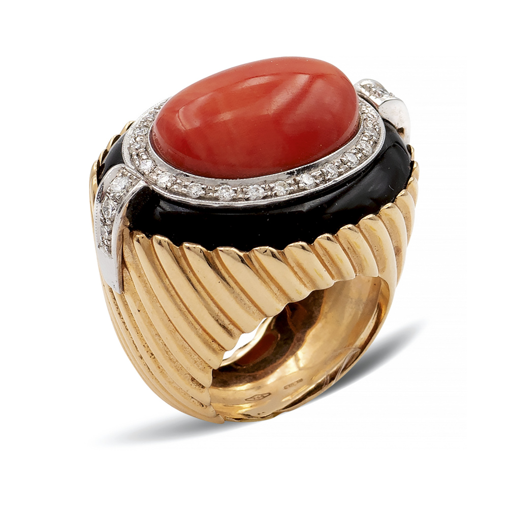Anello a ponte in oro rosa 18kt con corallo rossoanni 70/80peso 28,8 gr.taglio cabochon incastonato su oro bianco con diamanti taglio brillante ct 0,45 circa e sezione in onice nero, misura 17