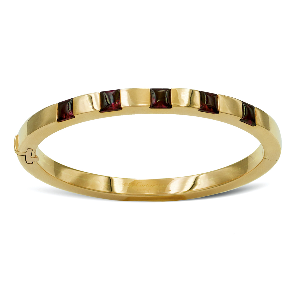 Cartier, bracciale a manettaanno 1997peso 31,8 gr.in oro giallo 18kt con incastonati cinque granati taglio cabochon, firmato, numerato e datato all'interno n. E53141, diametro 6 cm.