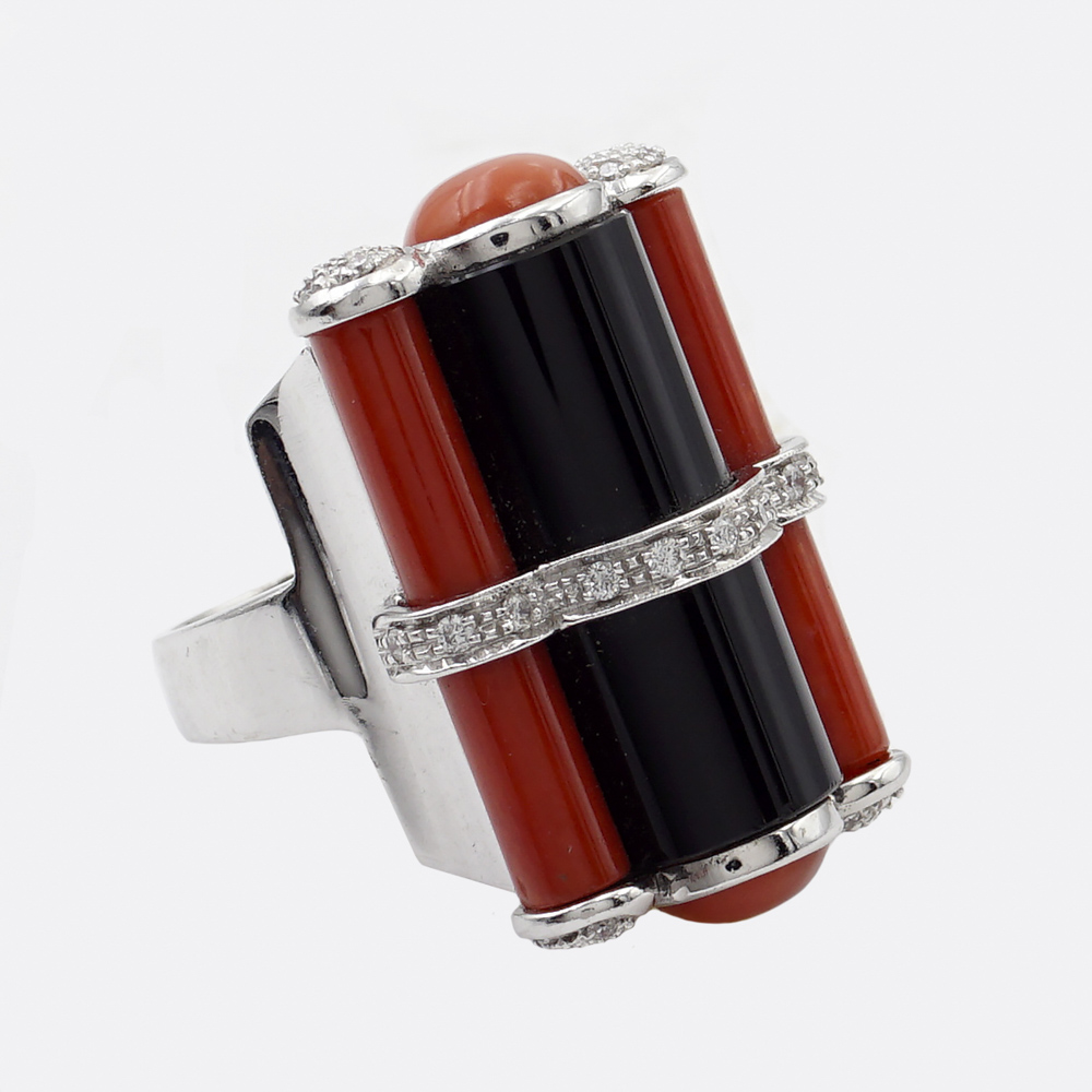 Anello in oro bianco 14kt onice nero e corallopeso 20 gr.tagliati a sezioni cilindriche impreziositi da diamanti taglio brillante ct 0,30 circa, misura 17