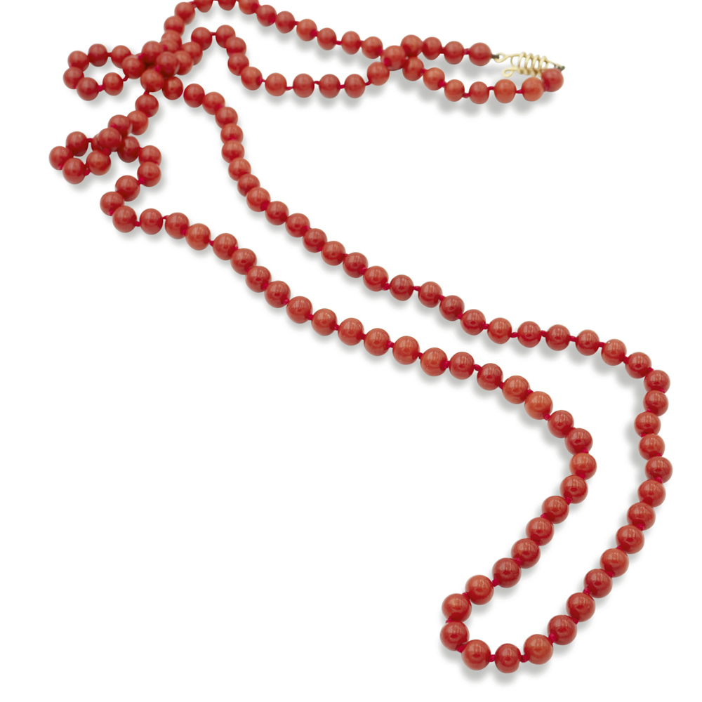 Lunga collana ad un filo di coralli rossipeso 69 gr.tagliati a sfere 7,5 mm. circa, chiusura in oro giallo 18kt, lunghezza 104 cm.