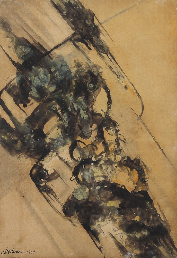 FERDINANDO CHEVRIER Livorno 1920 - 2006  Senza titolo, 1959 tecnica mista su carta cm. 50x35, firma e anno in basso a sinistra, dichiarazione d'autenticità dell'artista su foto, pubblicato sul catalogo della mostra "Ferdinando Chevrier, vivere l'immaginario", tenutasi dal 23 novembre 2002 al 2 febbraio 2003, presso il Palazzo Bottini Dell'Olio (LI), pagina 59.