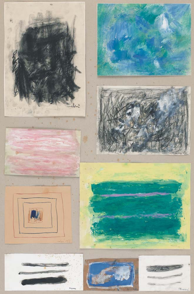 GINO MELONI Varese 29/04/1905 - Lissone (Va) 23/02/1989 Senza titolo, 1956-58 composizione di 9 tecniche miste su carta di varie dimensioni applicate su cartoncino di cm. 87x59, tutti firmati in basso a destra, uno datato 1956 e due datati 1958 in basso a destra, pubblicato sul catalogo della mostra "Collezione Pozzi d'Arte Contemporanea, opere su carta" a cura di Walter Guadagnini, tenutasi presso la Civica Raccolta del Disegno, Comune di Salò, Sala dei Provveditori nel marzo-aprile 1995, pagina 32 con tavola a colori.