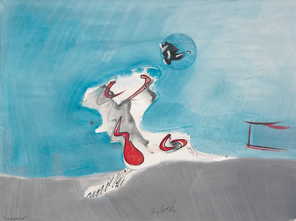 SERGIO DANGELO Milano 1932 La minaccia tecnica mista su carta cm. 46x62, firma in basso al centro, titolo in basso a sinistra, dichiarazione d'autenticità dell'artista su foto.