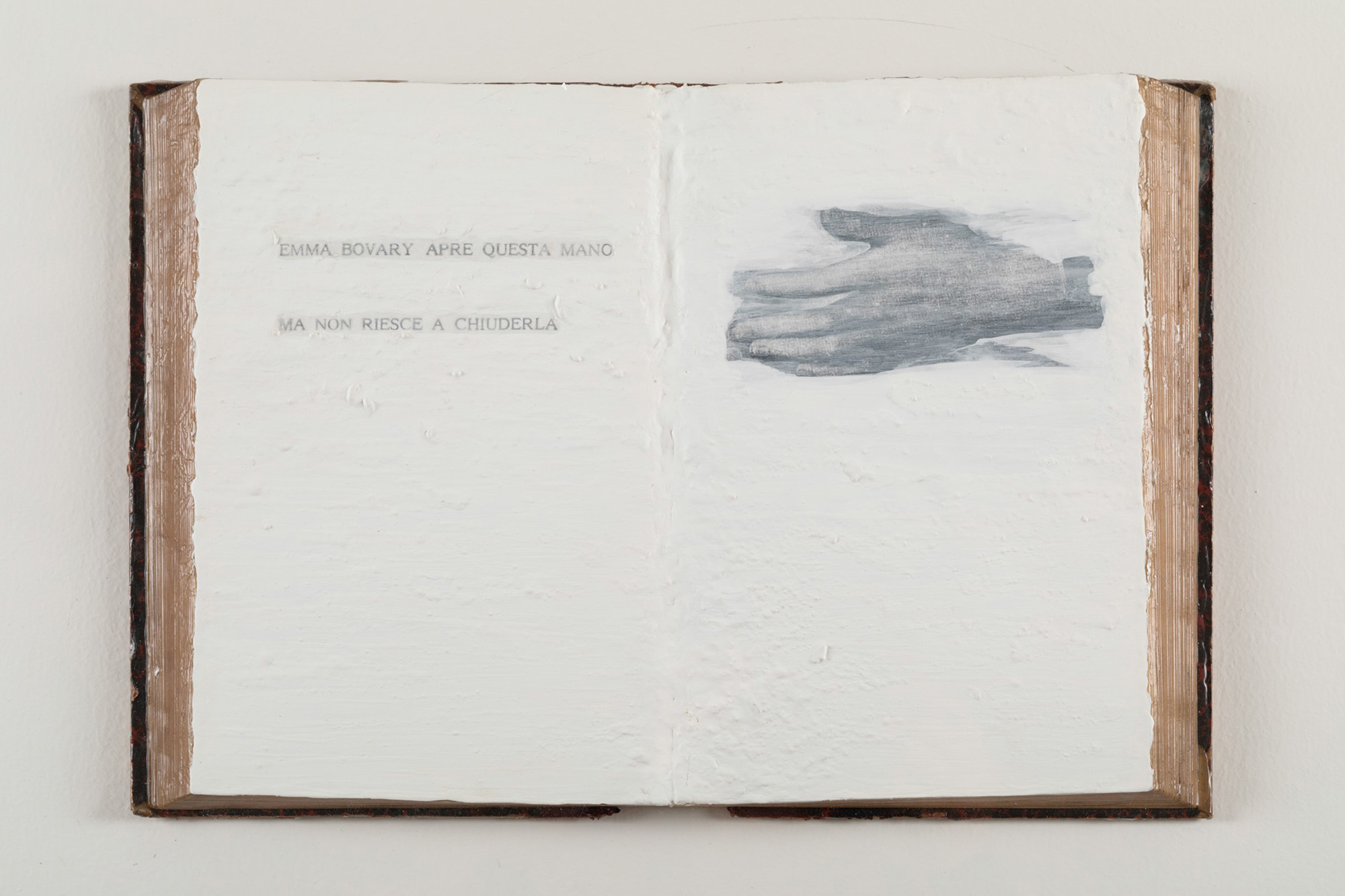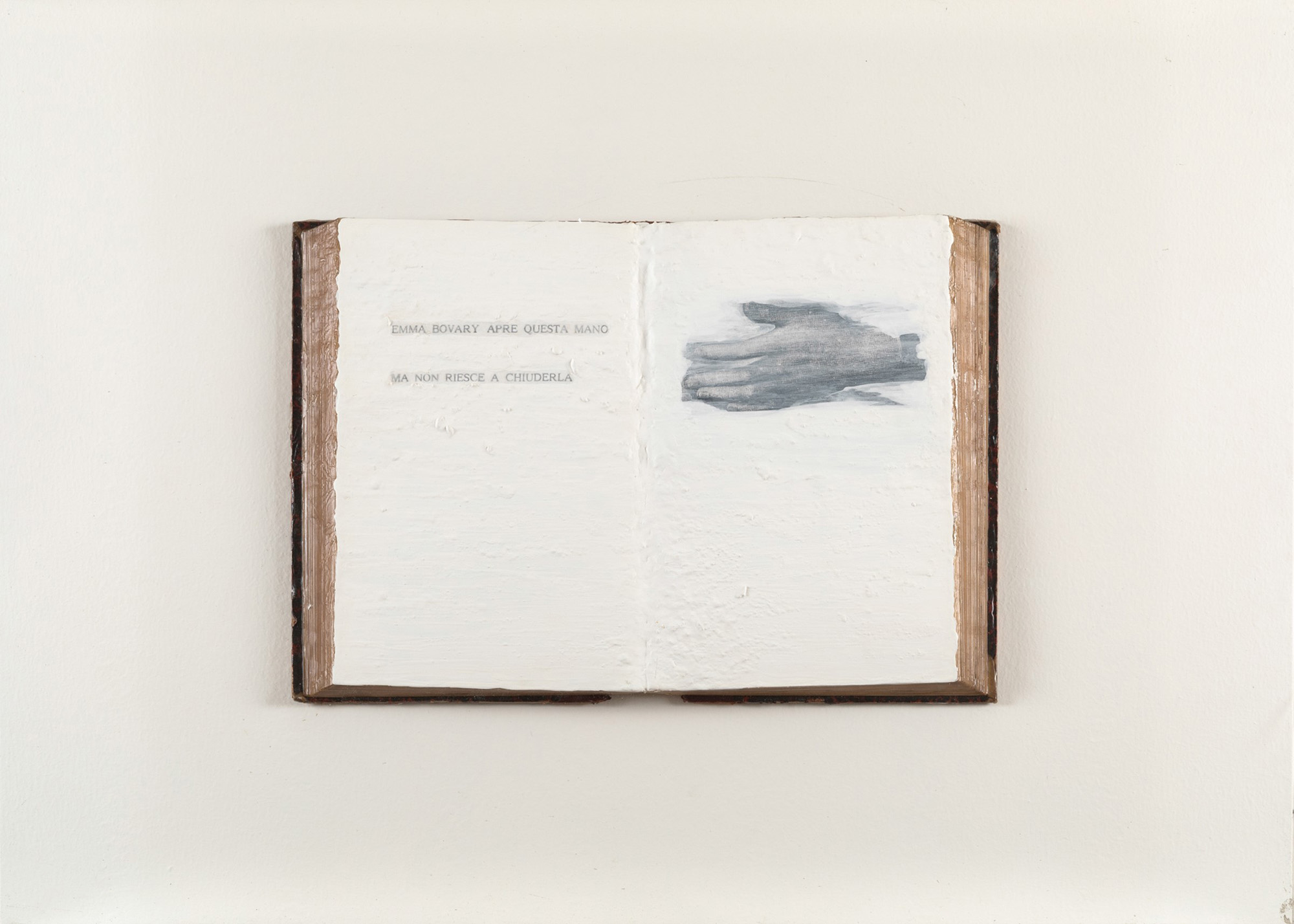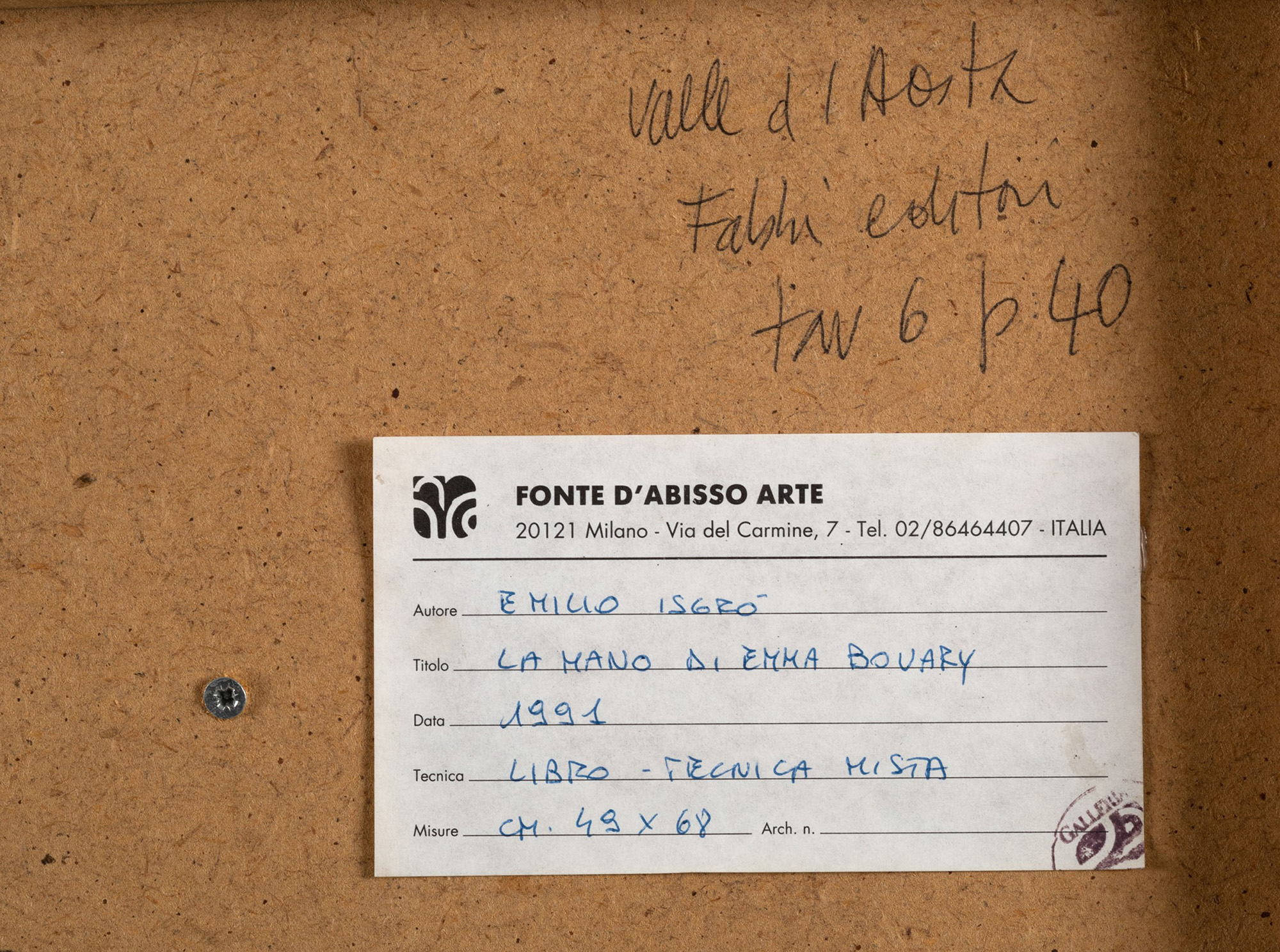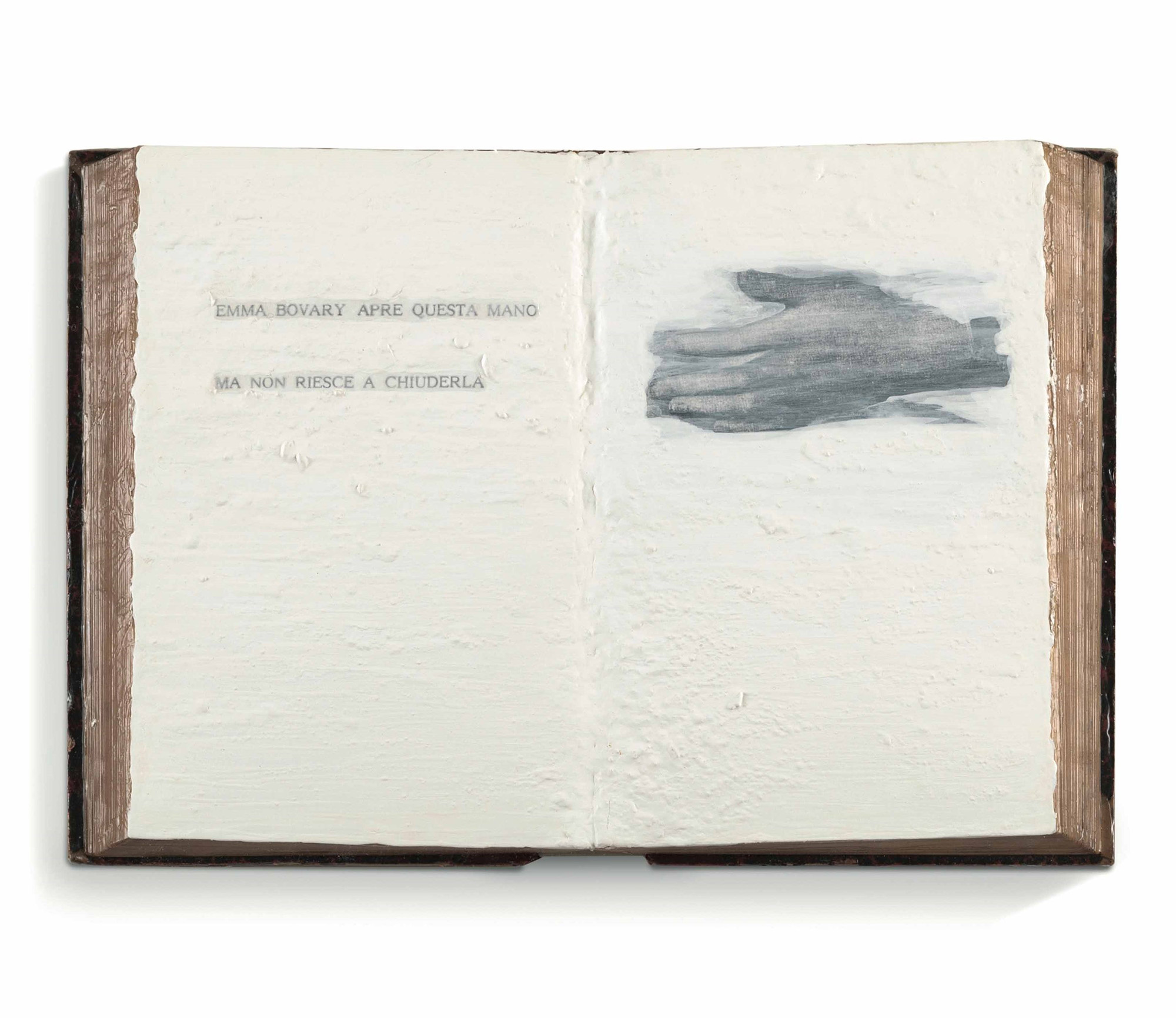 libro e tecnica mista in teca di plexiglas, cm 49x68x8,5 firmato, intitolato e datato al retro Etichetta al retro della Galleria Fonte d’Abisso Arte, Milano Etichetta al retro della Galleria La Scaletta, Reggio Emilia , Esposizioni: C’è chi dice Madame Bovary, installazione per quattro quadri, quattro pale e ventitré libri, a cura di M. Giaveri, Torre del Lebbroso, Aosta, 22 giugno-15 settembre 1991 Bibliografia: C'è chi dice Madame Bovary, Fabbri Editori, Milano 1991, n. 6, ripr. p. 40