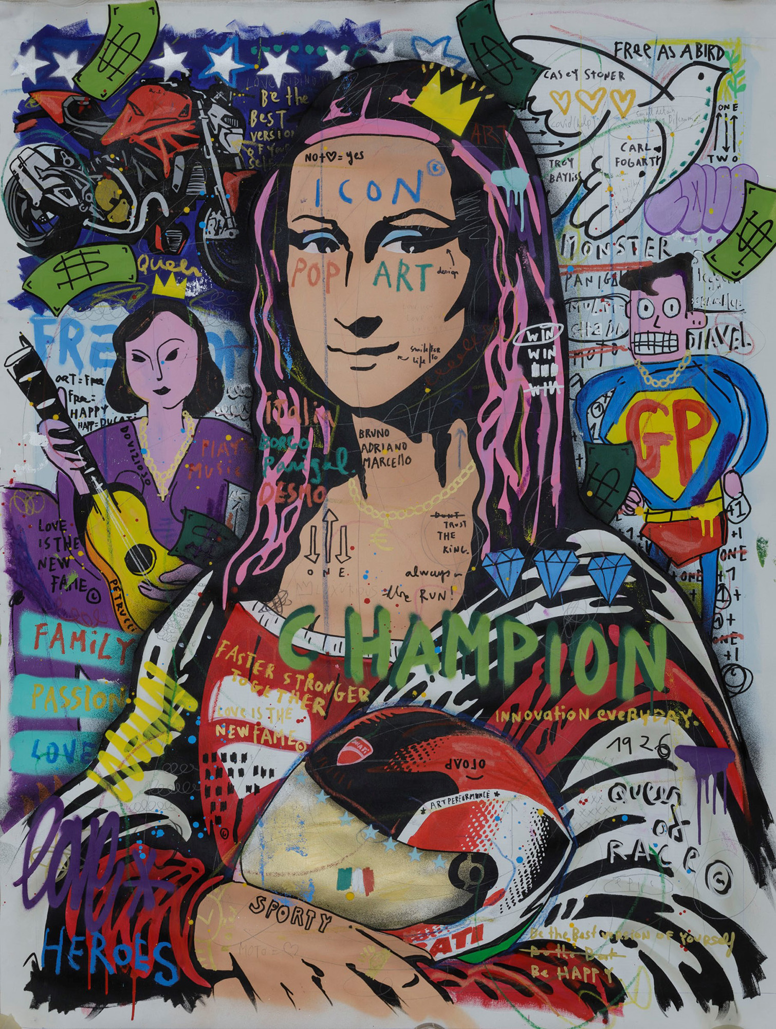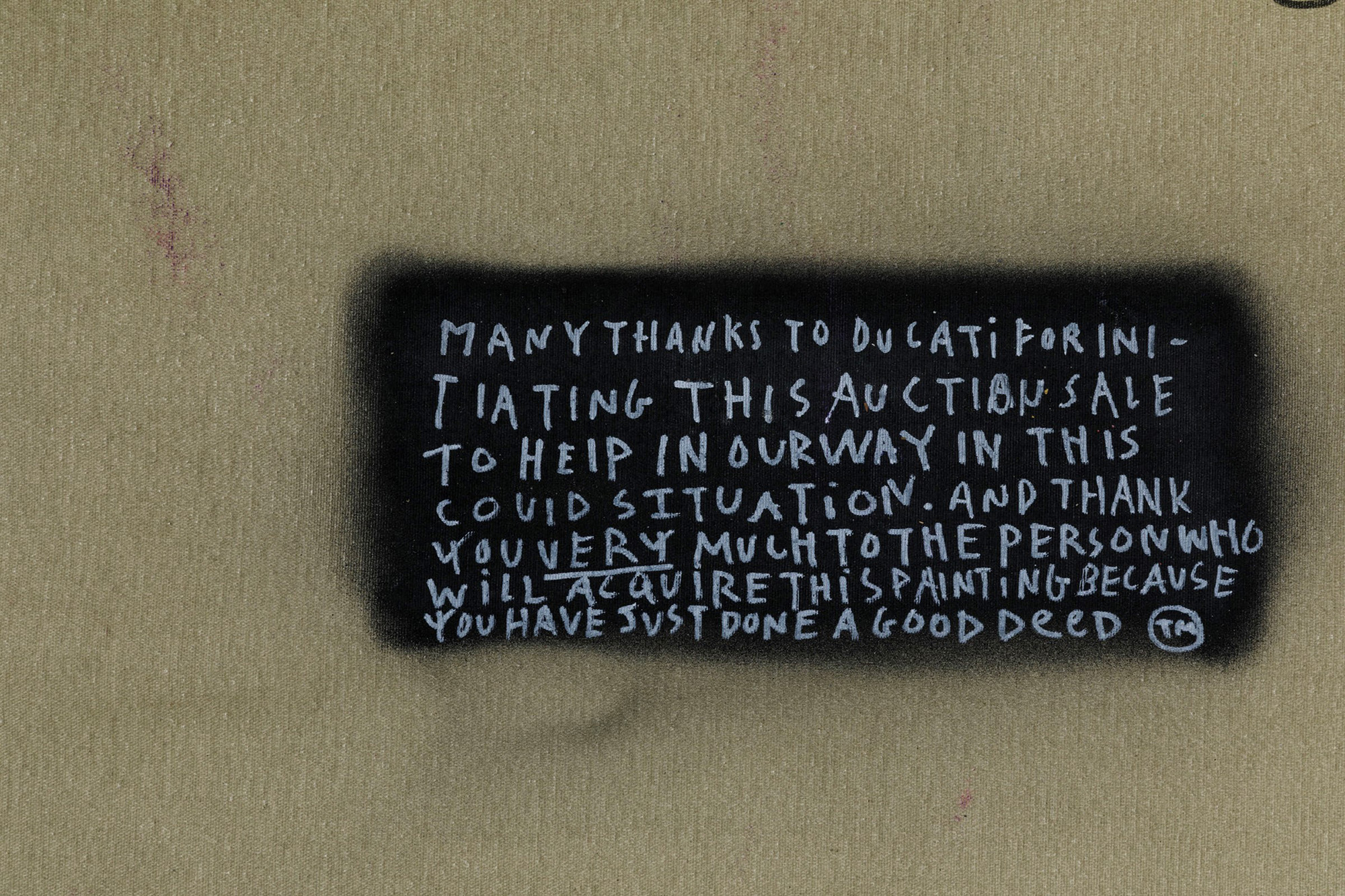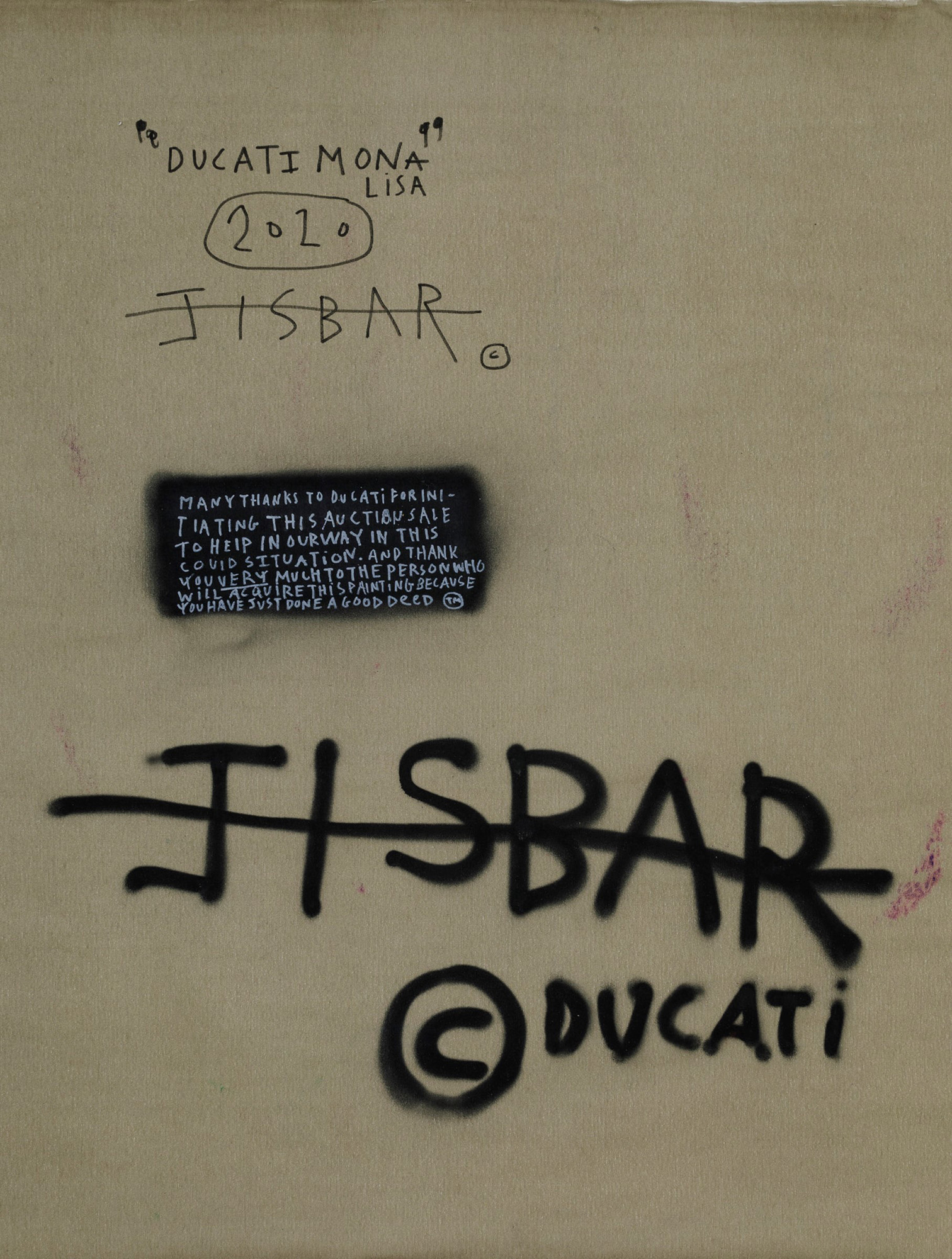 acrylic on canvas, cm 141x106 signed, titled and dated on the back on the back: Ducati Ducati Motor & Cambi Auctions for #RaceAgainstCOVID Ducati Motor Holding launched a challenge to its entire com- munity in May 2020: #RaceAgainstCOVID, a fundraiser organ- ized by the Borgo Panigale company whose goal is to raise the necessary funds to finance equipment, research and staff of the Policlinico di Sant’Orsola in Bologna dedicated exclusively to the care of patients in post Covid-19 convalescence. The members of the Ducati Board started off the collection of funds, followed by many other employees. The sum collected was then doubled by the company, reaching the amount of 100,000 euros, the start- ing point for #RaceAgainstCOVID. The Borgo Panigale company is now continuing its challenge thanks to the contribution of Jisbar: for this initiative the French artist has in fact created the work Mona Lisa Ducati, a unique painting of Pop Art dedicated to the passion for the iconic Italian brand, requesting that the en- tire proceeds from the auctioning of his work be donated to the Sant’Orsola Hospital in Bologna. Ducati has found in Cambi an ideal partner in the front line against Covid-19 after the great success achieved with the Bene ca De- sign Loves Milano auction, which raised 120,000 euros for the Sacco Hospital in Milan.