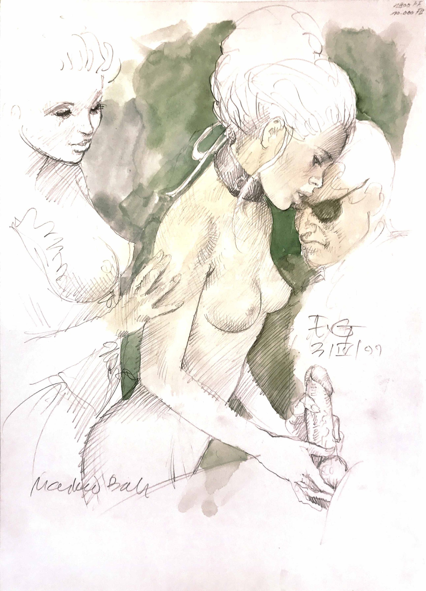 Illustrazione matita e acquerello su cartoncino. Cm 41,5x29,5. Firmata e datata 1999. Ottimo stato., Disegnatore britannico dal passato misterioso viene alla ribalta negli anni ’70 disegnando storie ed illustrazioni per la rivista erotica “Torrides”. Dotato di uno stile elegante e retrò diviene celebre in tutto il mondo per le sue graphic novel a sfondo erotico e sadomaso.