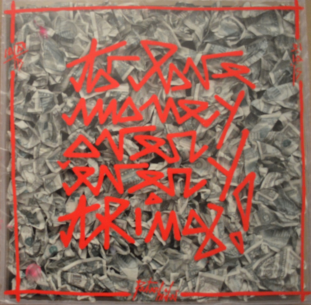 "The love Money over everything", mixed media and banknotes (fax-like dollars / euros) on camouflage canvas in painted plexiglass box cm. 50x50x5 of 2015.