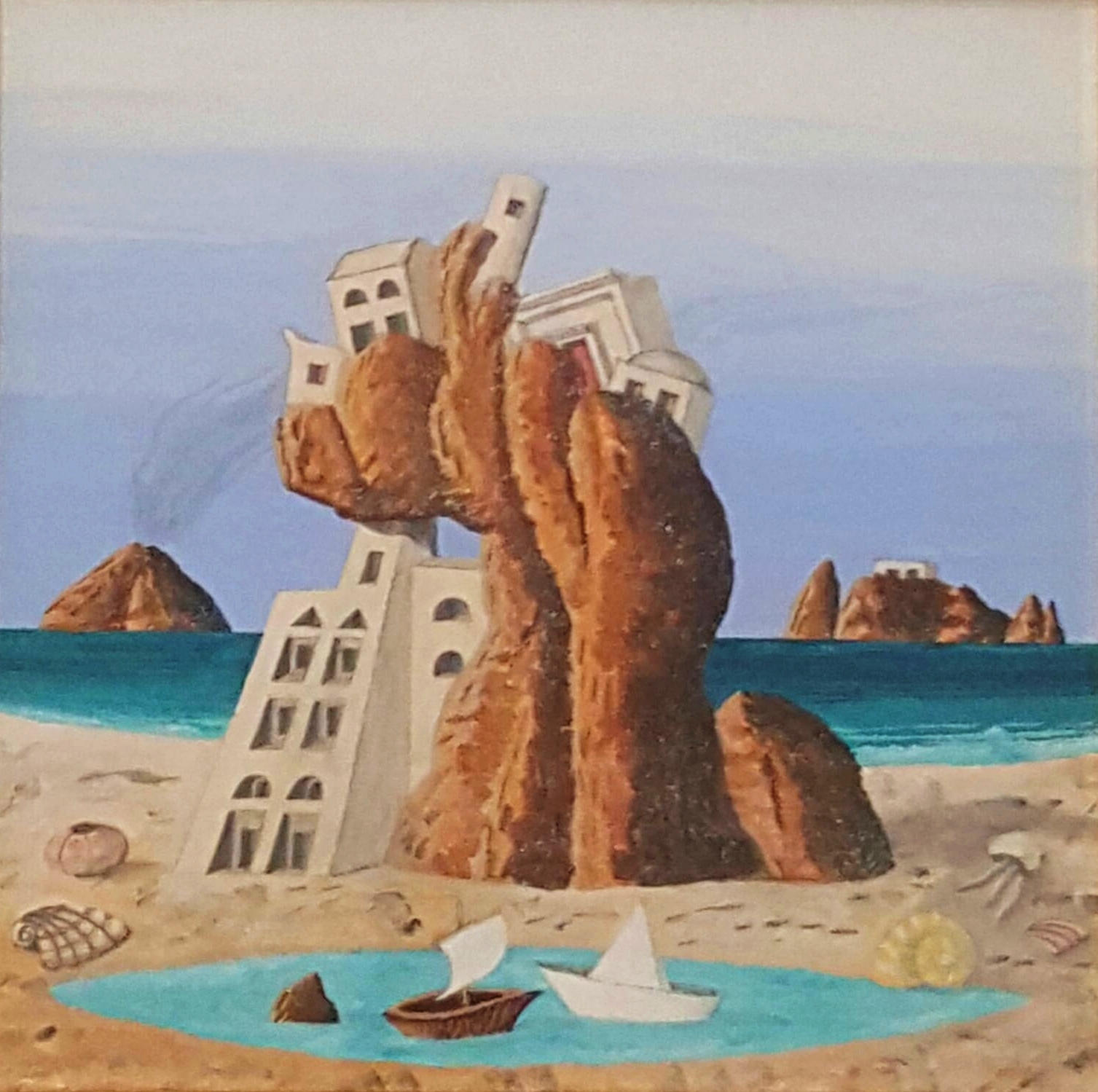 "Landscape under construction" oil on mdf cm. 30x30. On the back it is signed and titled. Authentication on photo of the gallery the Roof