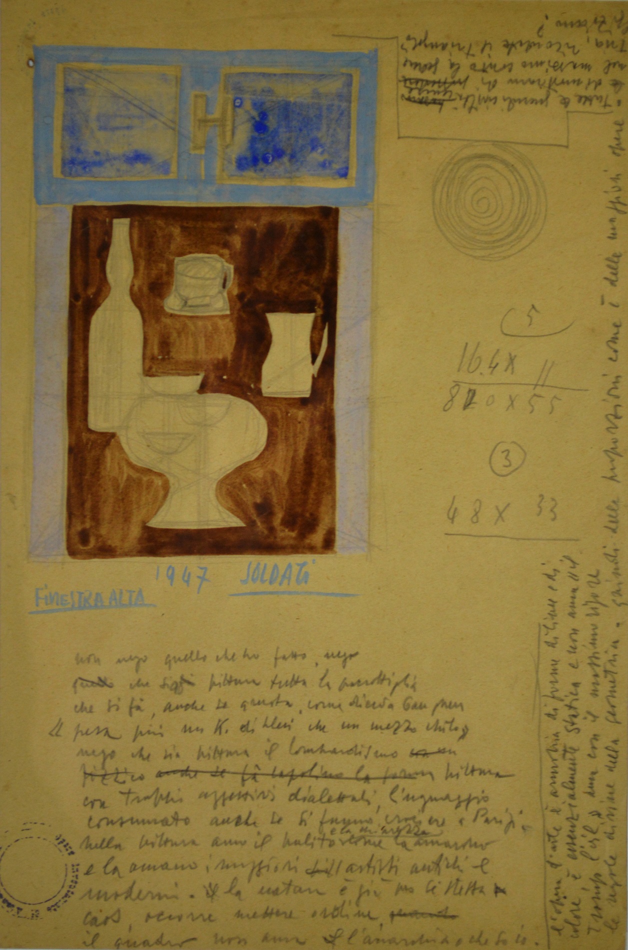 Finestra alta” tecnica mista su carta cm 21x32. Opera firmata, intitolata e datata 1947 nel centro dell’opera. Timbri dell’ archivio in alto e in basso a sinistra. Autentica su foto con timbri di provenienza eredi (Maria Garau ). Parma 1896 - Parma 1953