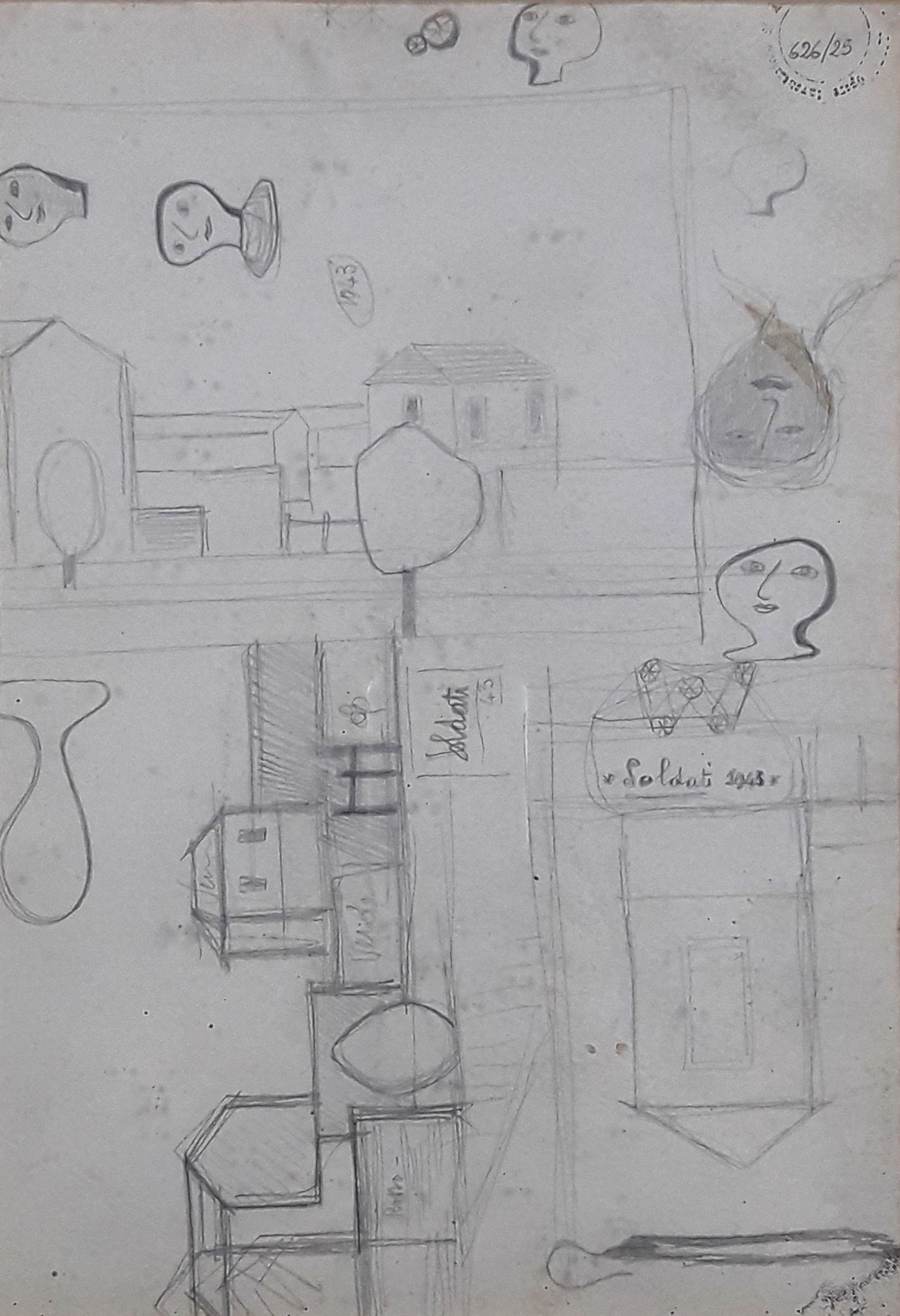 "9 studies of houses and heads" graphite on paper 23.5x39.5 cm. Signed work, titled and dated 1943 in the center of the work. Archive stamp on the top right. Authentication on photo with stamps from heirs (Maria Garau).