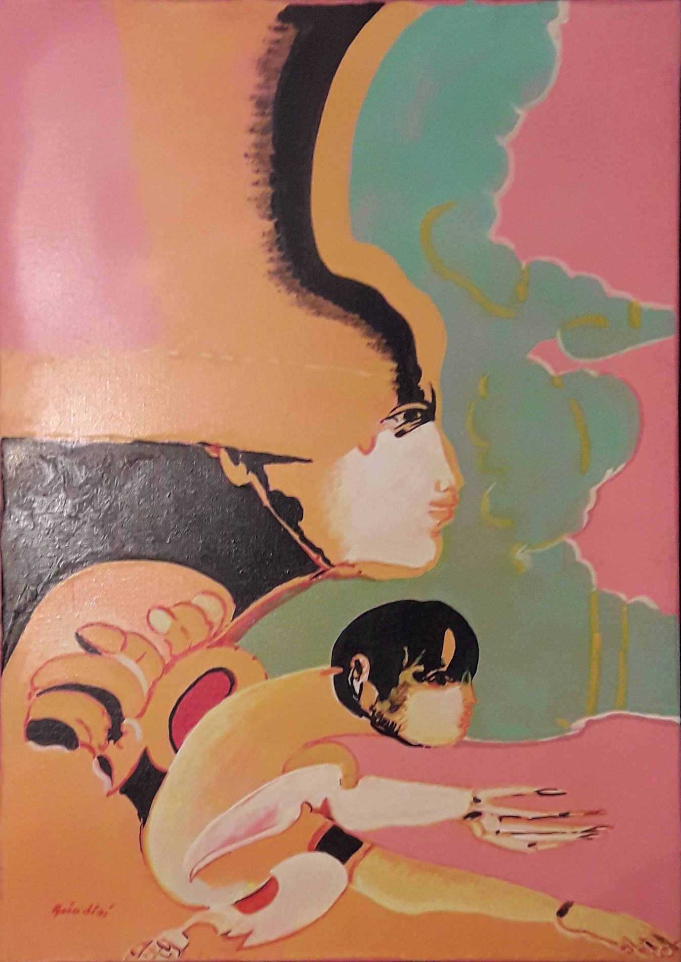“Maternità“ olio su tela cm. 70x50 anni 70. L’opera è firmata in basso a sinistra, sul retro è dedicata ad personam, firmata e presenta etichetta d’archivio Galleria Pace ed etichetta della casa d’aste Capitolium