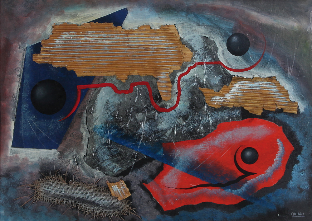 PIPPO ORIANI Torino 25/06/1909 - Roma 01/12/1972 Drammaticità cosmica, (1932/33) collage e olio su cartone telato cm. 50x70; firma in basso a destra, titolo, firma e anno al retro, pubblicato sul Catalogo Generale delle Opere di Oriani volume primo, testi di Giovanni Lista e Mariastella Margozzi, Editoriale Giorgio Mondadori, pagina 104 repertorio FPO/MV534.