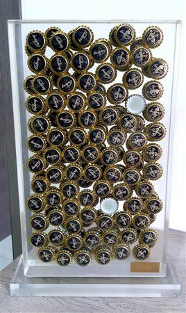 “Bonsantè” from 1996 inclusion and accumulation of carsberg / Tuborg beer bottle caps cm. 42x25x5 copy 27/30 signed and numbered by the master. Work with authentication and archive by "Denyse Durand-Ruel N .... on photos.