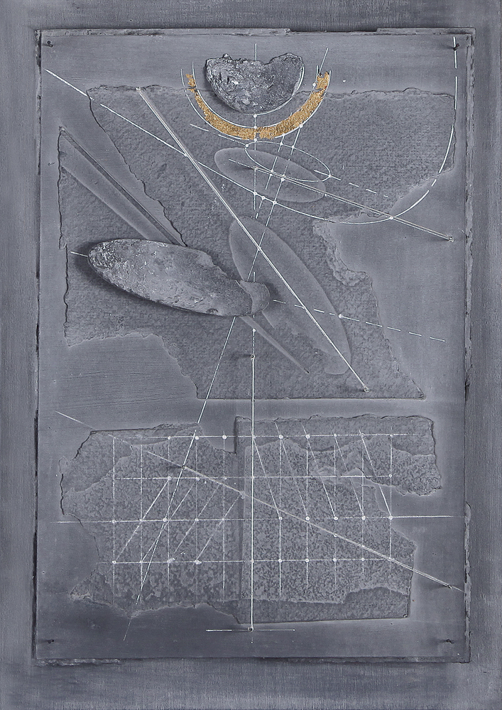 WALTER VALENTINI Pergola (Ps) 22/10/1928  Cielo, 1996 tecnica mista e applicazioni su cartone e tavola cm. 52,5x37, firma, titolo, etichetta dell'artista con titolo, anno e tecnica al retro, dichiarazione d'autenticità dell'artista su foto, entro teca in plexiglass.