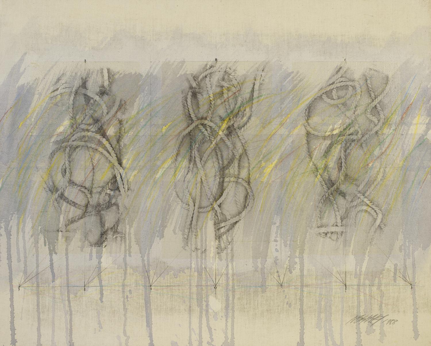 Noriaki Takahashi (1946) SPAZIO CON CORDE I olio, collage e tecnica mista su...