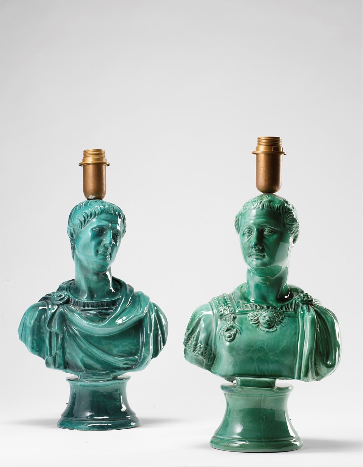 raffiguranti due busti di consoli romani in ceramica smaltata