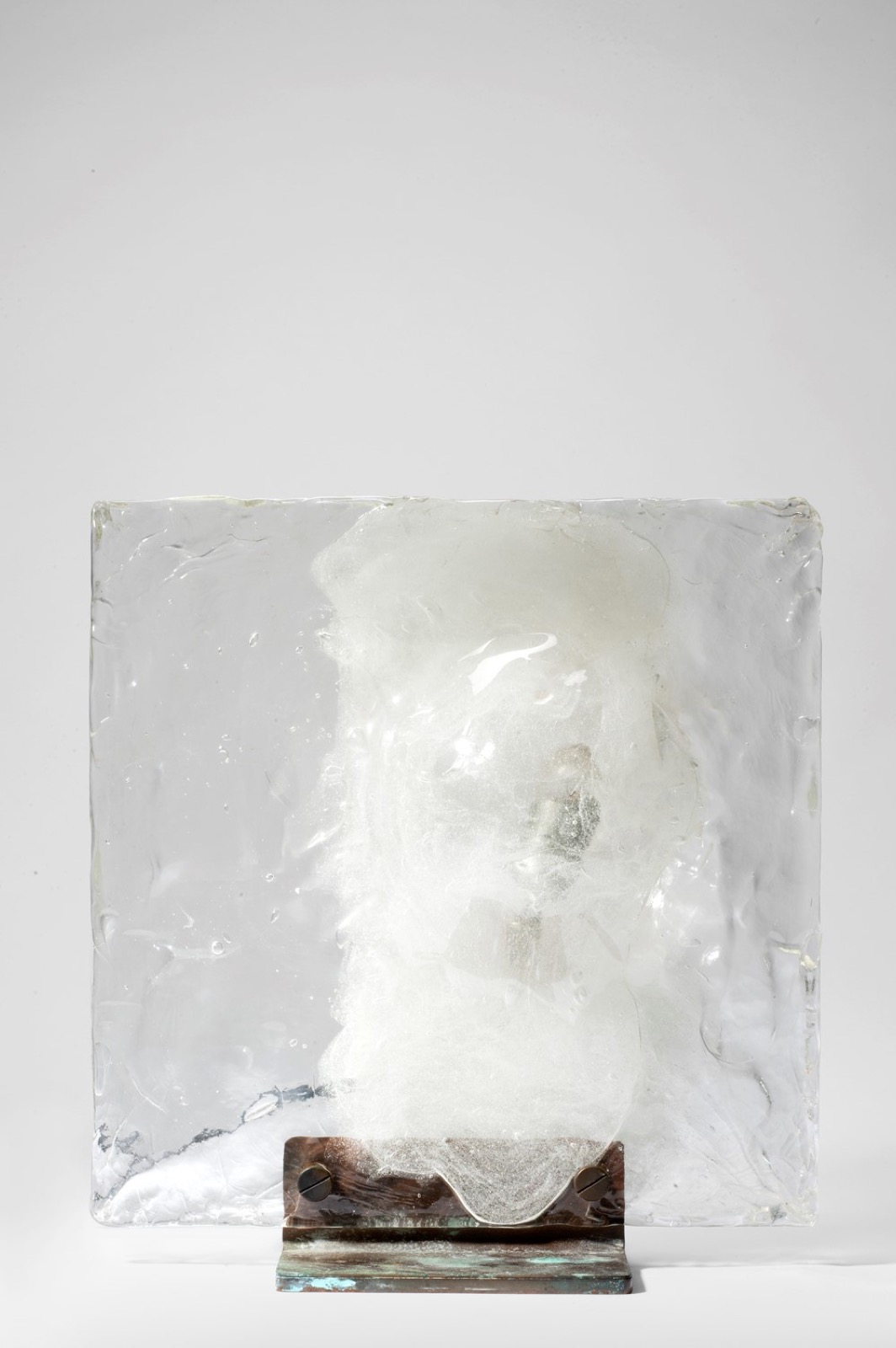 in vetro trasparente con inclusione di vetro lattimo lavorato a caldo, base in bronzo e ferro