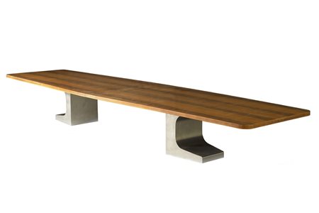 Il tavolo riunione Niemeyer, nato dalla creatività del grande Maestro brasiliano Oscar Niemeyer, esalta le funzioni e i valori dell’arredo direzionale: le misure imponenti del piano, che ben si adattano agli spazi prestigiosi; l'immagine di grande solidità viene amplificata dal doppio basamento scultoreo in legno integrato da un telaio metallico. Il tavolo è dotato di top access elettrificato e di passaggio cavi integrato nel basamento.con base in acciaio e piano in legno