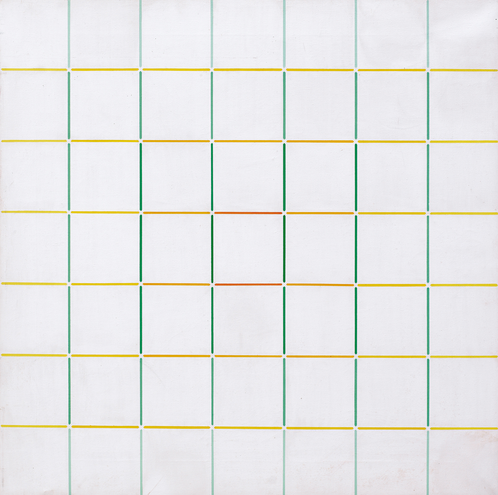 HANS JORG GLATTFELDER Zurigo 10/07/1939 Ortogonales netz mit negativen diagonalen I, 1973 olio su tela cm. 90x90, firma, titolo e anno al retro.