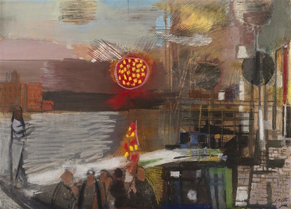 Bruno Saetti "Traghetto della Giudecca" 1955 tecnica mista su carta applicata su tela