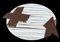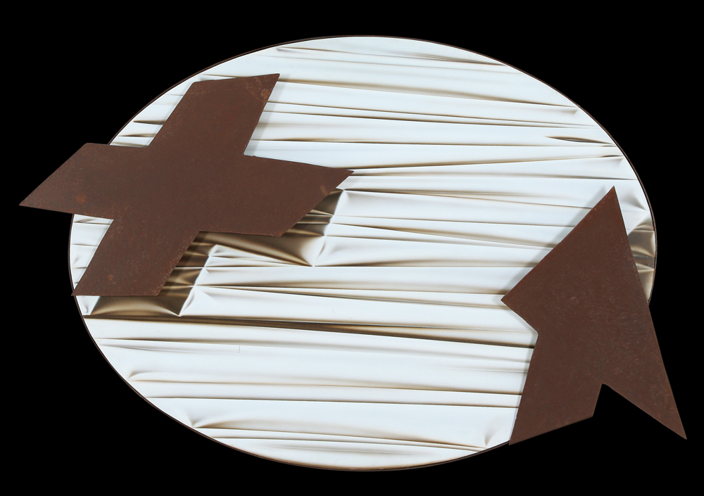UMBERTO MARIANI Milano 16/11/1936 Senza titolo: X con freccia, 1989 acrilico su tela applicata su tavola ovale e lastra di ferro cm. 90x120, firma, titolo e anno al retro, pubblicato sul catalogo della mostra "Umberto Mariani opere 1966-1991" a cura di Enrico Crispolti, tenutasi nel maggio-giugno 1992 presso il Nuovo Museo Archeologico (TE), tavola 61, dichiarazione d'autenticità dell'artista su foto.