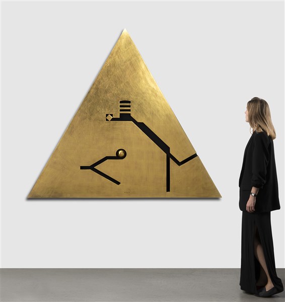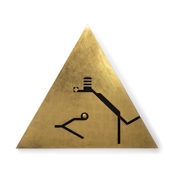 Lucio Del Pezzo "Piramide" 1969 legno dipinto a foglia d'oro cm 127x145x12 Firma