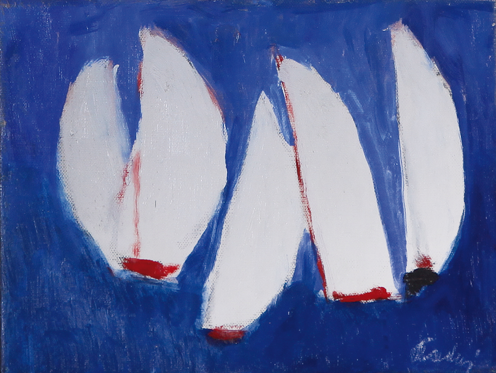 ENRICO PAULUCCI Genova 03/10/1901 - Torino 22/08/1999  Vele, (fine anni '70) olio su tela cm. 18x24, firma in basso a destra, opera registrata presso l'Archivio delle Opere di Enrico Paulucci (TO) al numero A335 come da dichiarazione a cura di Federico Riccio datata 16 novembre 2005 su foto.