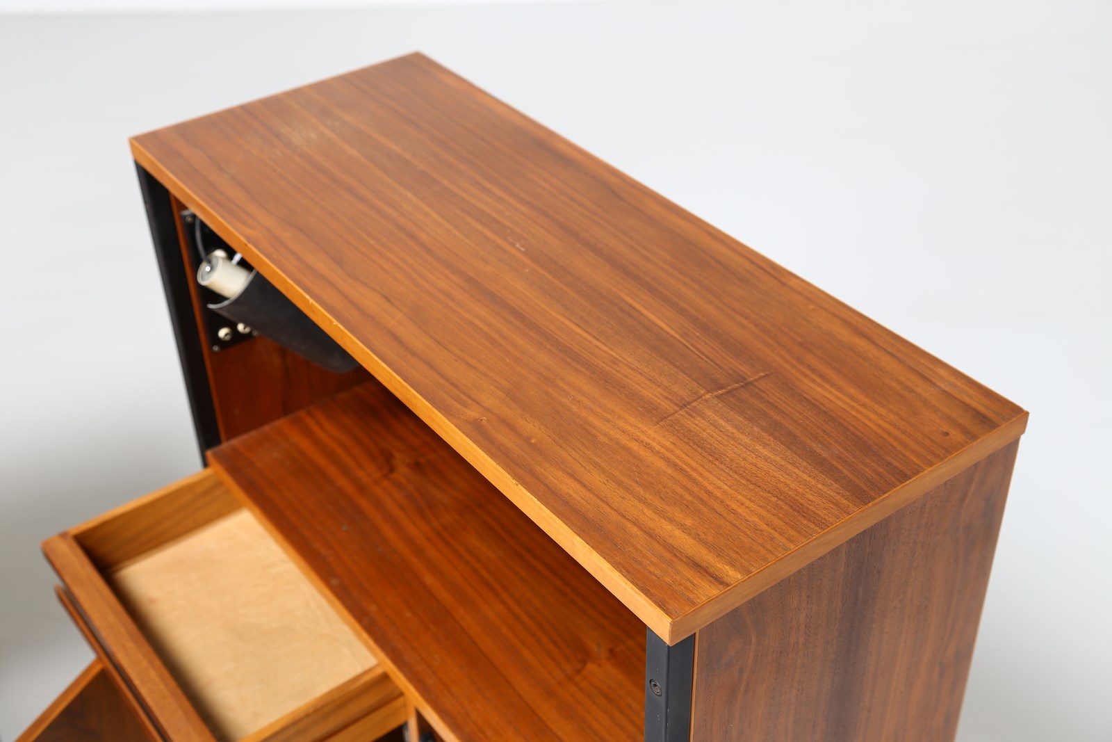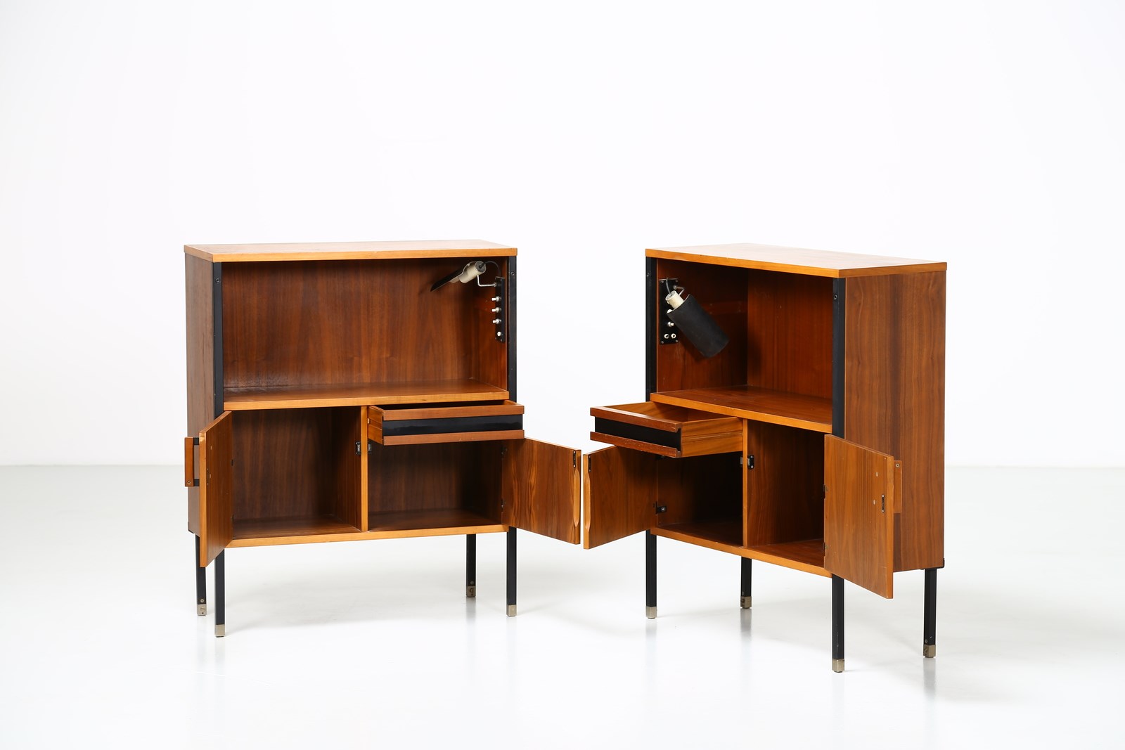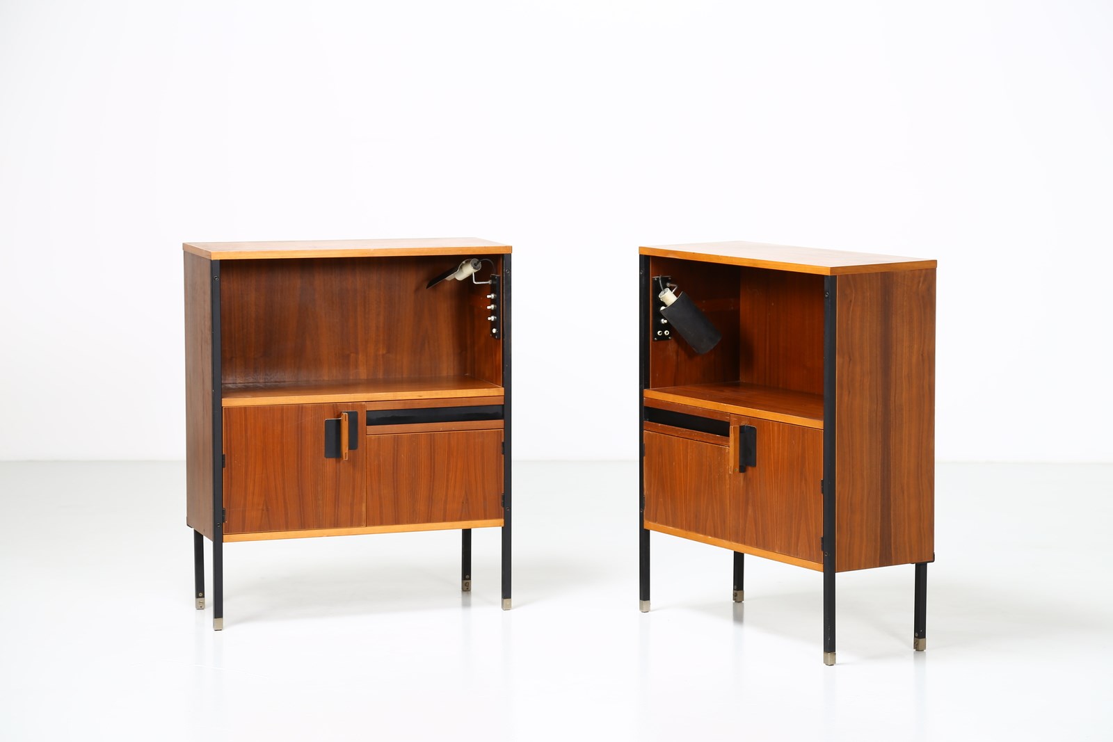 PARISI ICO (1916 - 1996) Coppia di comodini modello Positano, produzione MIM, 1959. (2). Legno di noce e metallo verniciato.. Cm 73,00 x 89,00 x 30,00. Etichetta manifattura. Bibliografia: Domus n. 351 febbraio 1959, p. 49