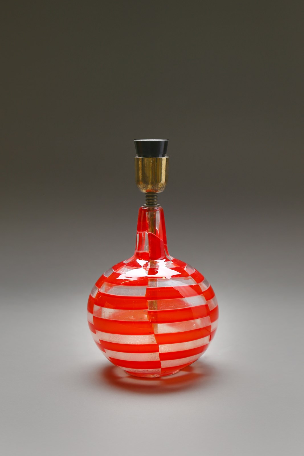 BAROVIER ERCOLE (1889 - 1974) Lampada da tavolo in vetro a tessere orizzontali in colore rosso e trasparente. Seconda metà anni ’50. . Ottone e vetro.. Cm 18,00 x 25,00 x 18,00. Bibliografia (per tipo di lavorazione): A. Dorigato, L’Arte dei Barovier , ed. Arsenale, 1993, fig. 144