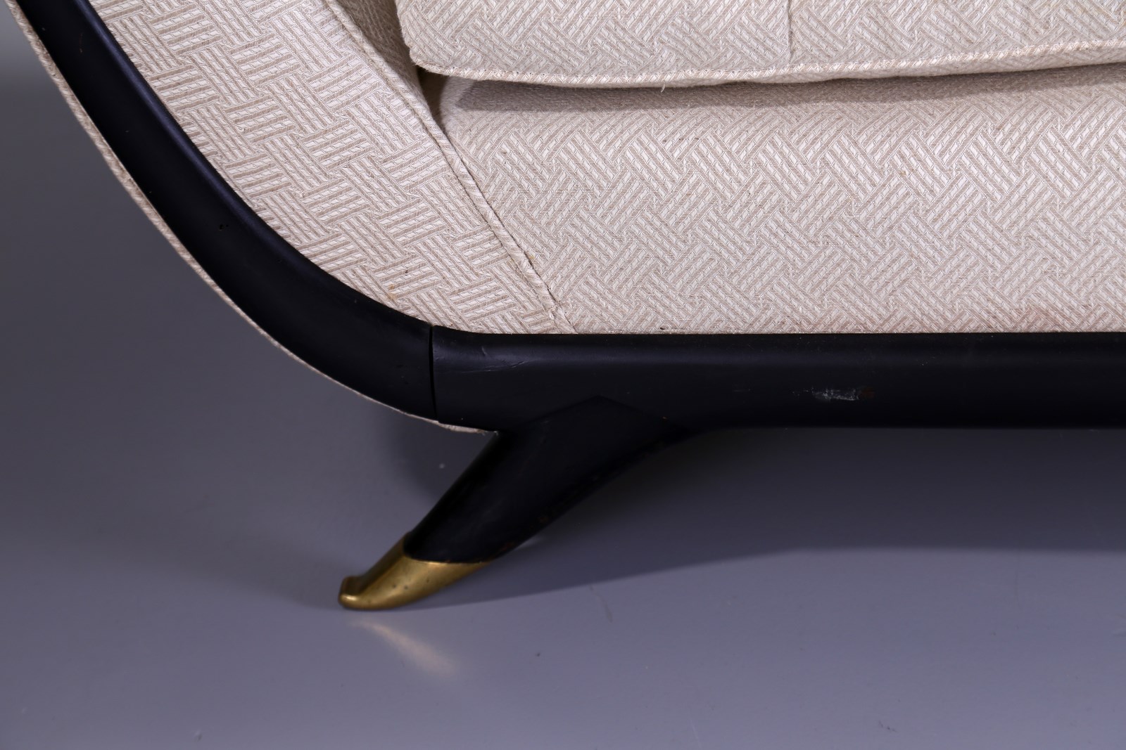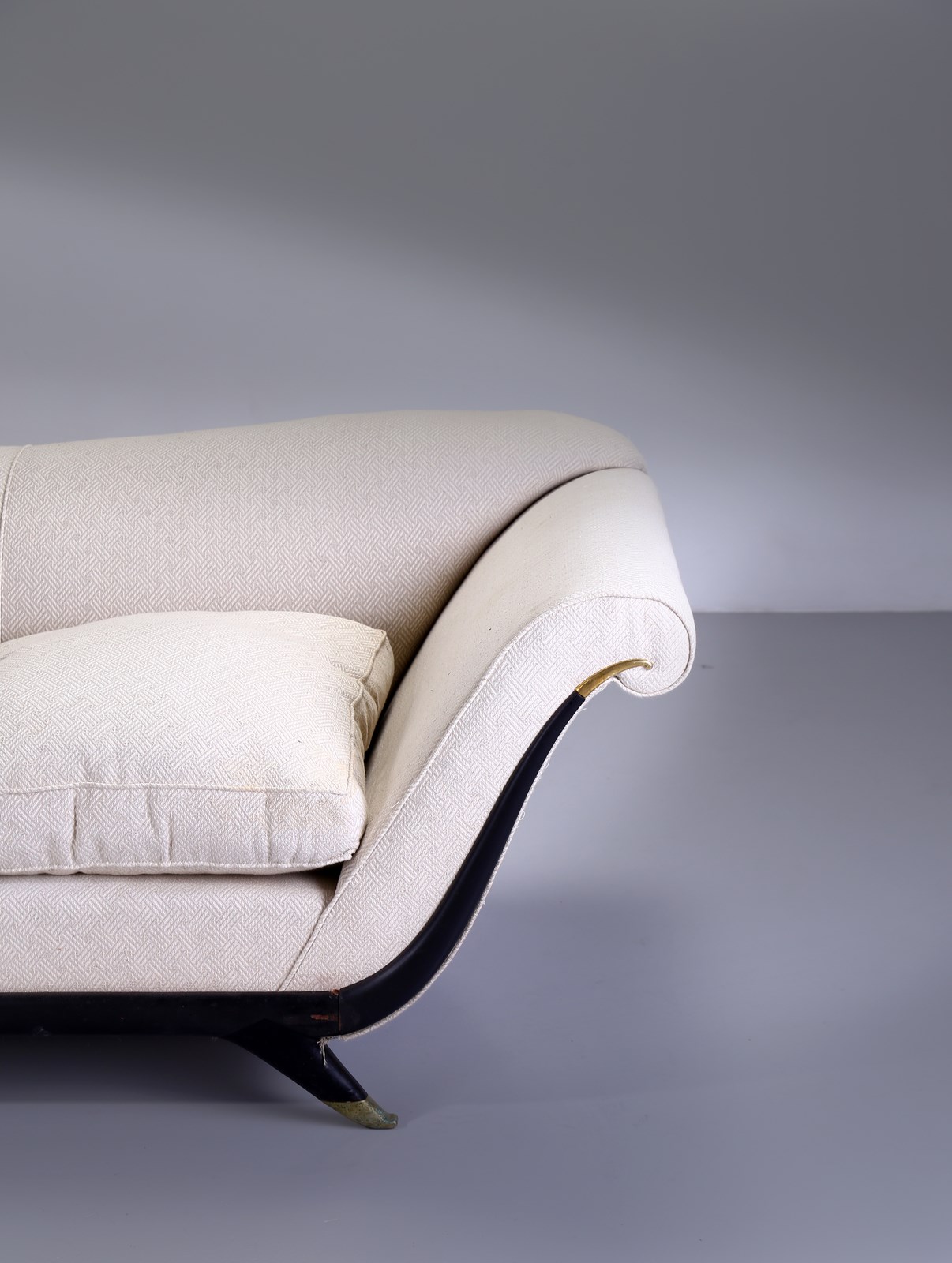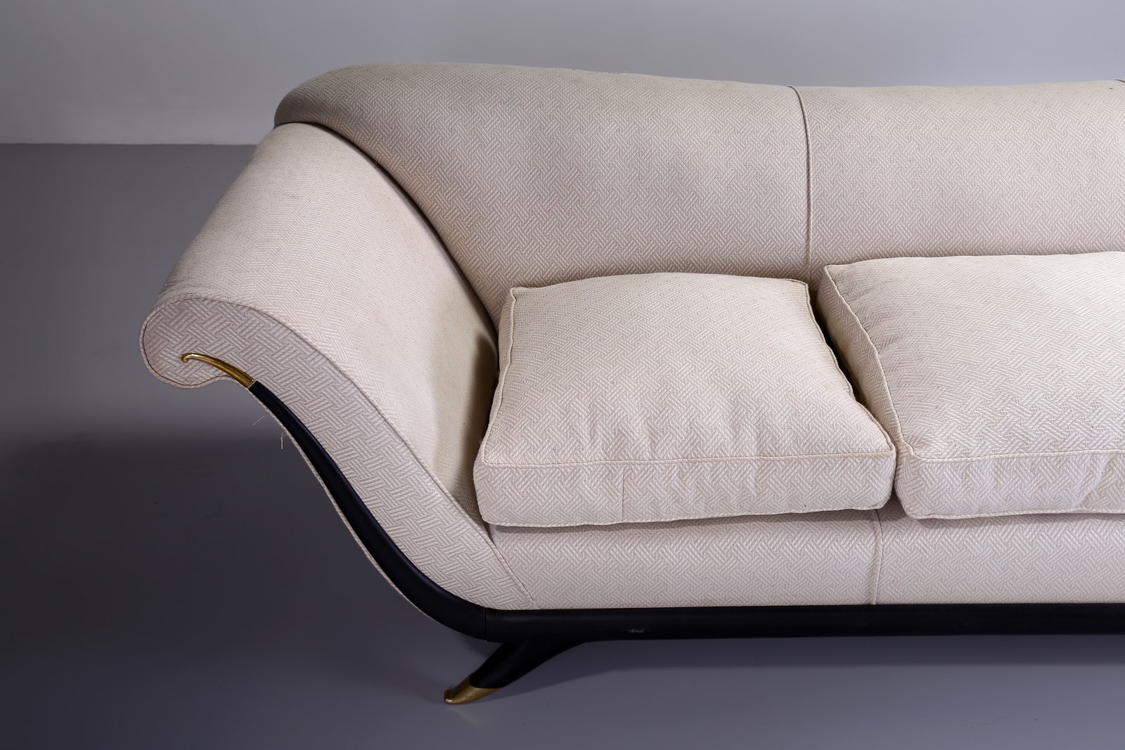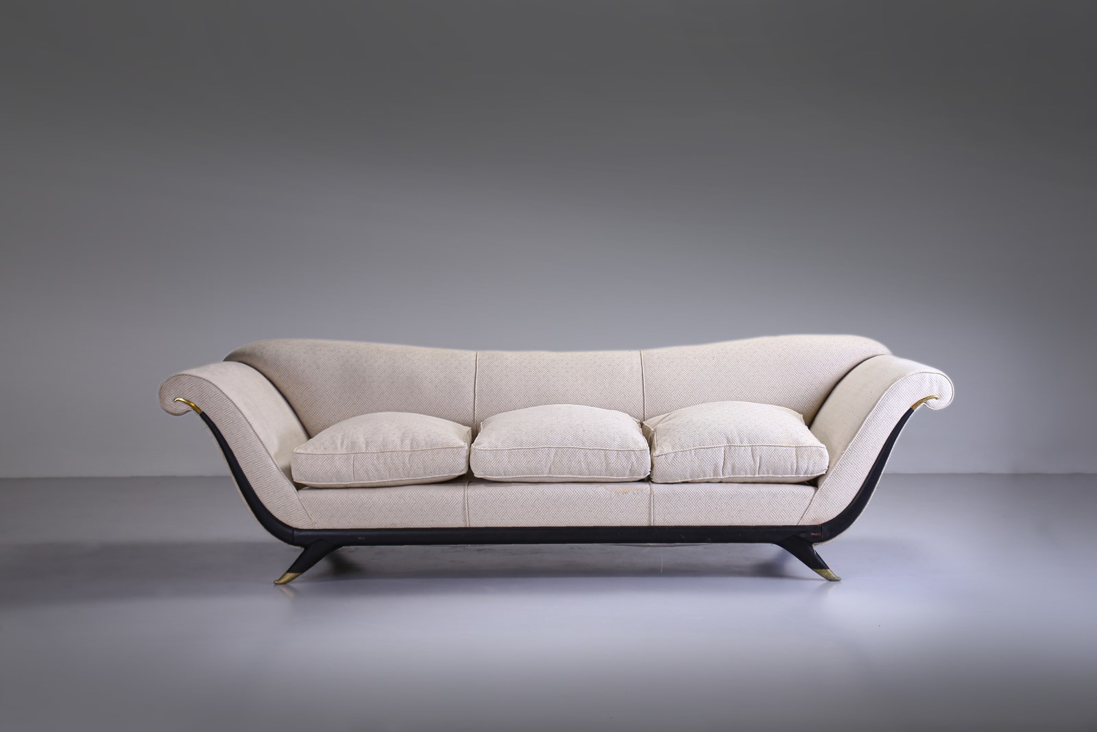 ULRICH GUGLIELMO (1904 - 1977) (attribuito) Divano anni '50. Legno laccato, ottone e tessuto imbottito.. Cm 250,00 x 172,00 x 9,00. Bibliografia (per un modello simile): Scacchetti L. , Guglielmo Ulrich, Federico Motta Editore, 2009, p. 251.