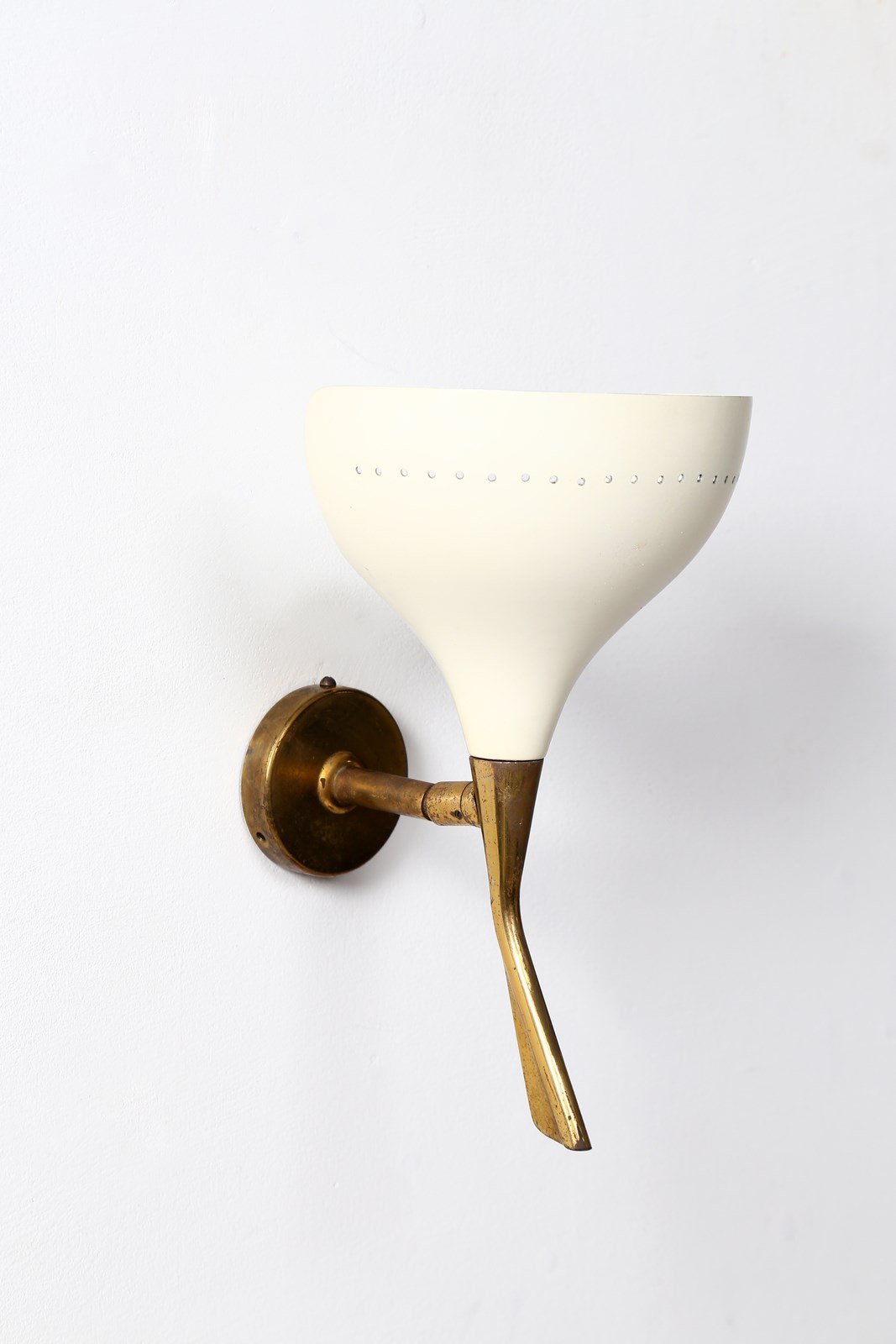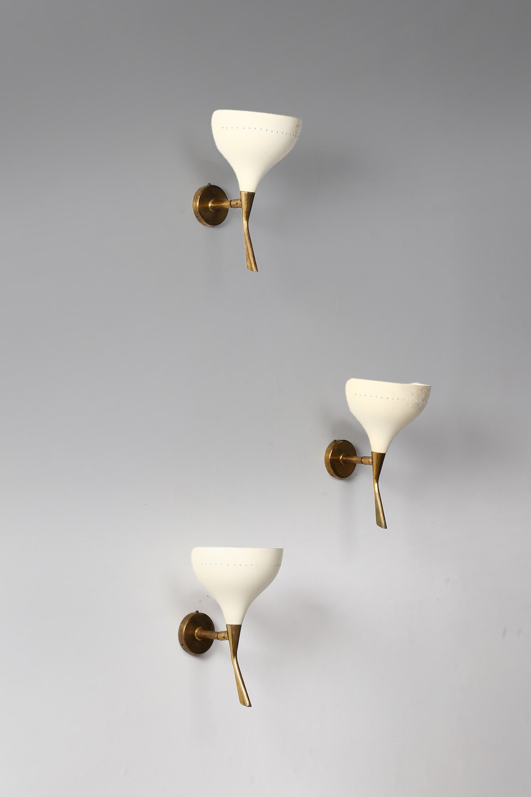 TORLASCO OSCAR (1934 - 2004) Tre lampade da parete modello D12, produzione Lumen, anni '50. (3). Ottone e alluminio verniciato.. Cm 18,50 x 25,00 x 15,00. Bibliografia: (per modello simile); Catalogo Lumen, modello D12