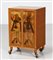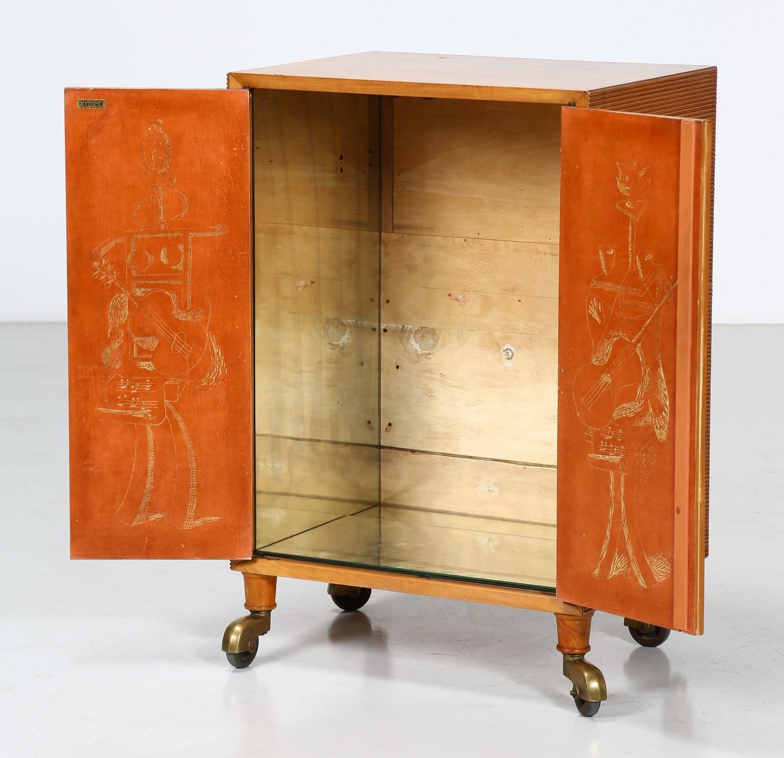SCREMIN LUIGI (1896 - 1983) Cabinet disegnata da cartone preparatorio di Marino Meo, produzione Fratelli Scremin, Belluno anni '40. Legni in varie essenze e ottone.. Cm 60,00 x 90,00 x 43,50. Etichetta della manifattura.