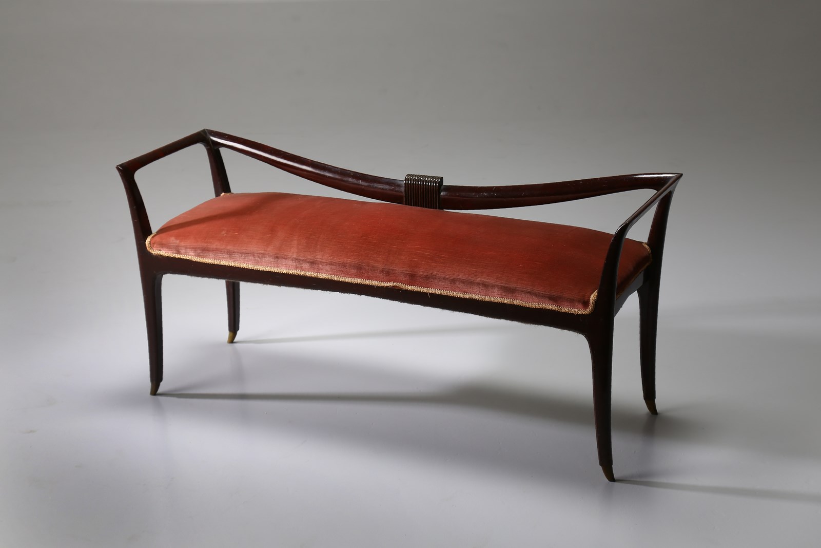 ULRICH GUGLIELMO (1904 - 1977) Panca anni '50. Legno laccato e tessuto imbottito.. Cm 118,50 x 56,00 x 37,00.