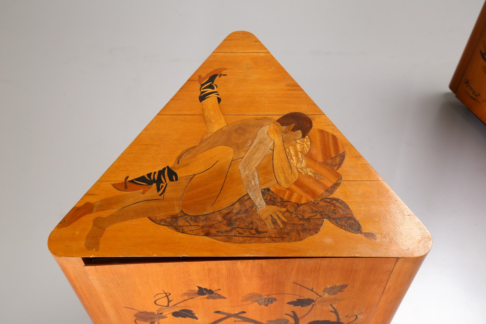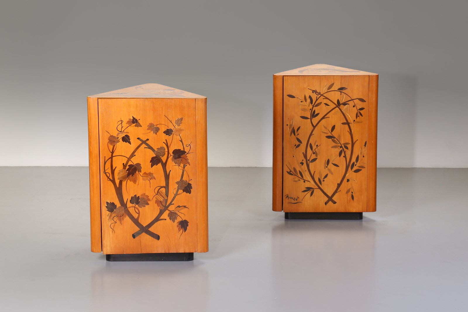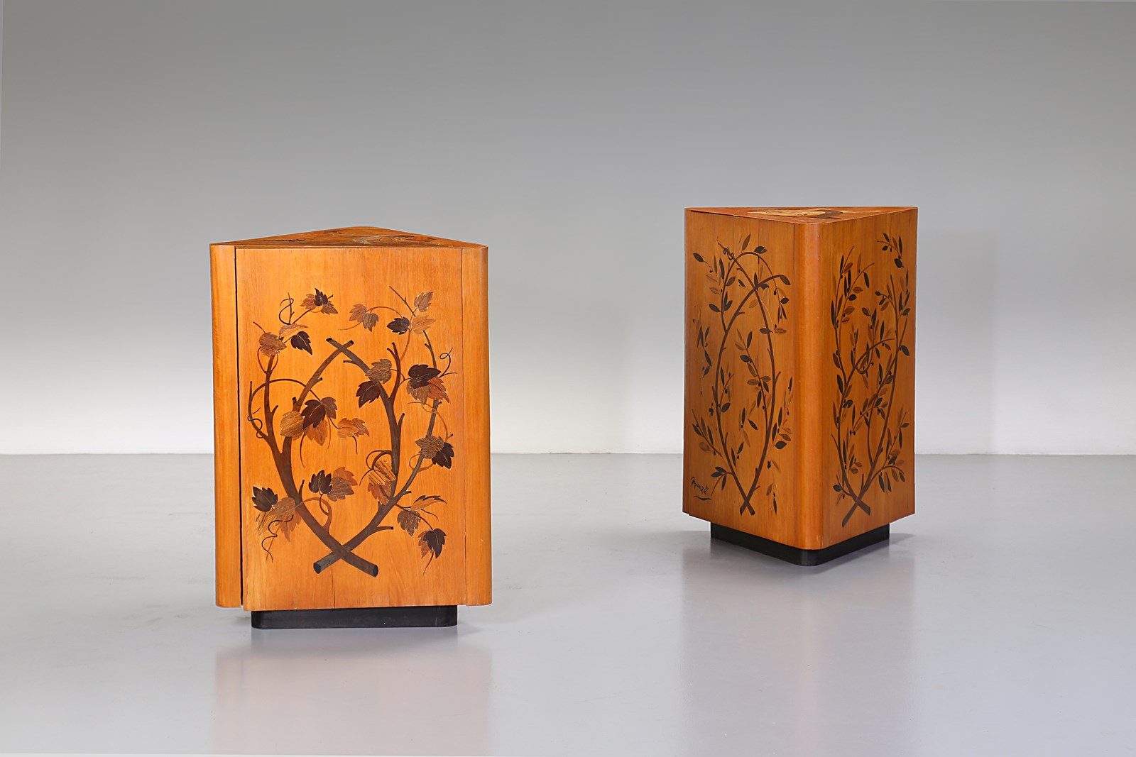MANZU' GIACOMO (1908 - 1991) Coppia di angoliere, eseguite dall'ebanista Eugenio Gritti, Bergamo, 1977. Legni di varie essenze. Cm 56,00 x 91,00 x 64,00. Firma dell'artista. Archiviate presso la Fondazione Giacomo Manzù di Aprilia.