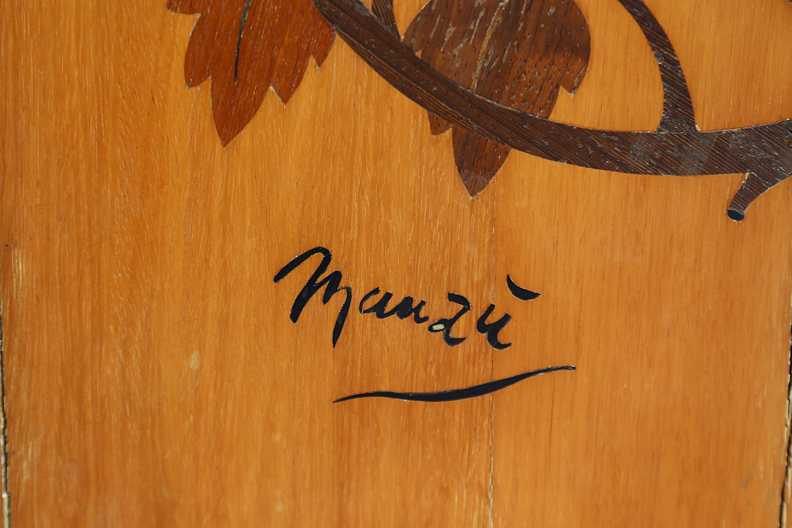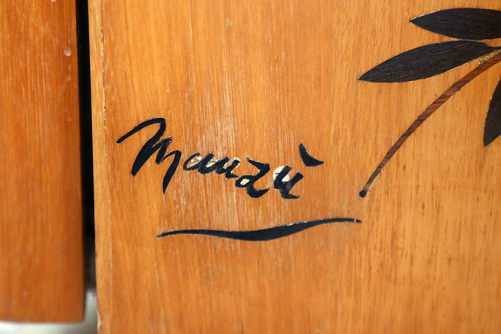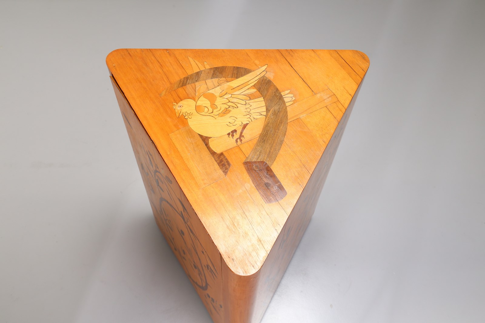 MANZU' GIACOMO (1908 - 1991) Coppia di angoliere, eseguite dall'ebanista Eugenio Gritti, Bergamo, 1977. Legni di varie essenze. Cm 56,00 x 91,00 x 64,00. Firma dell'artista. Archiviate presso la Fondazione Giacomo Manzù di Aprilia.