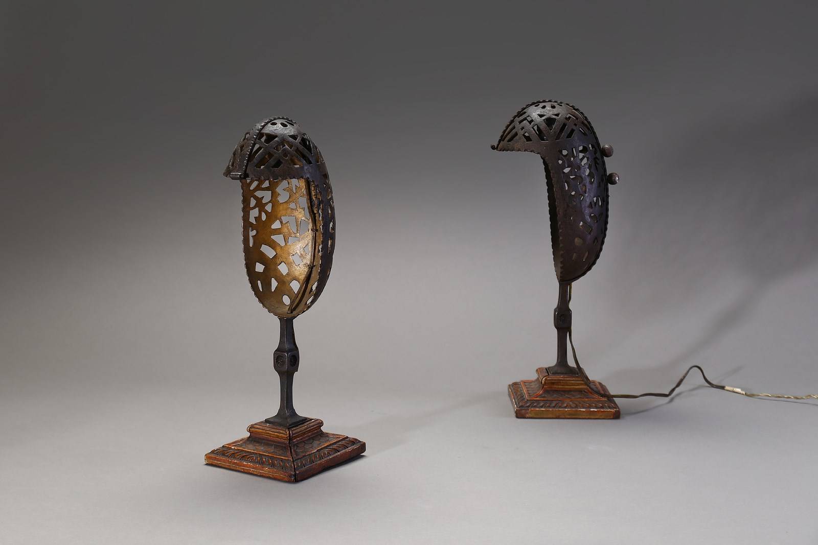 MAZZUCOTELLI ALESSANDRO (1865 - 1938) Coppia di lampade da tavolo anni '20. (2). Ferro forgiato legno.. Cm 13,00 x 40,00 x 13,00. Firma incisa.