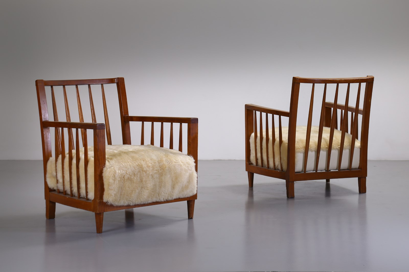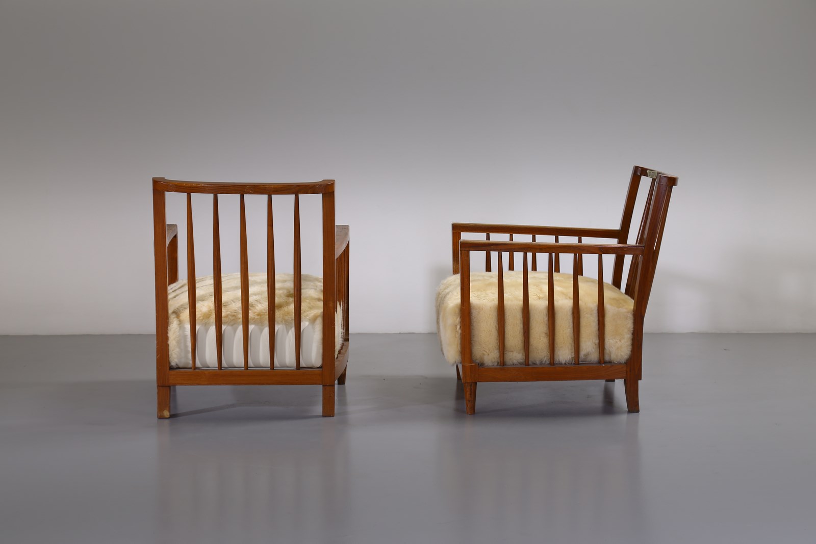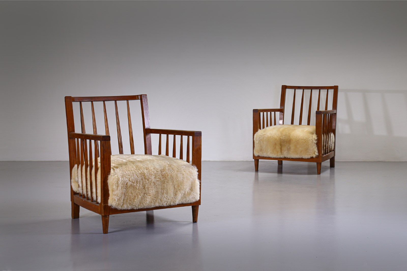 TEMPESTINI MAURIZIO (1908 - 1960) Coppia di poltrone anni '30. (2). Legno di castagno e pelliccia sintetica.. Cm 70,00 x 85,00 x 70,50.