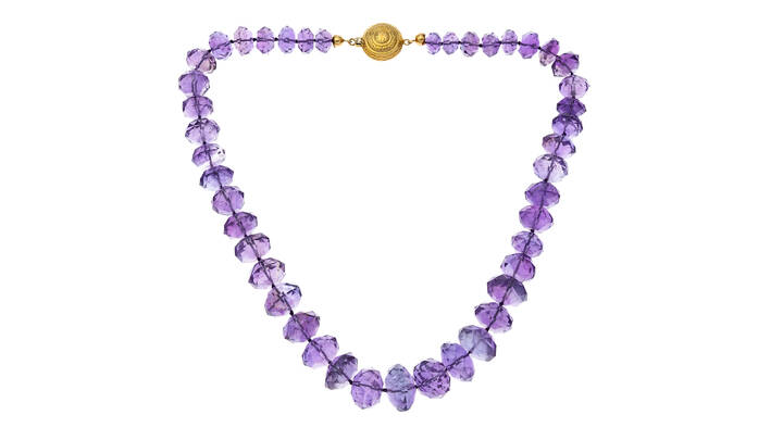 composto da dischi di ametiste briolette, a scalare da mm 10 a 17,3 ca. Chiusura in oro giallo di forma rotonda bombata