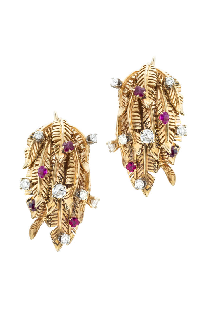 in oro giallo 12 Kt, ad amo, anni '40, con cascata di piume tremblant e diamanti taglio brillante per totali ct 0,50 ca e rubino taglio rotondo a decoro