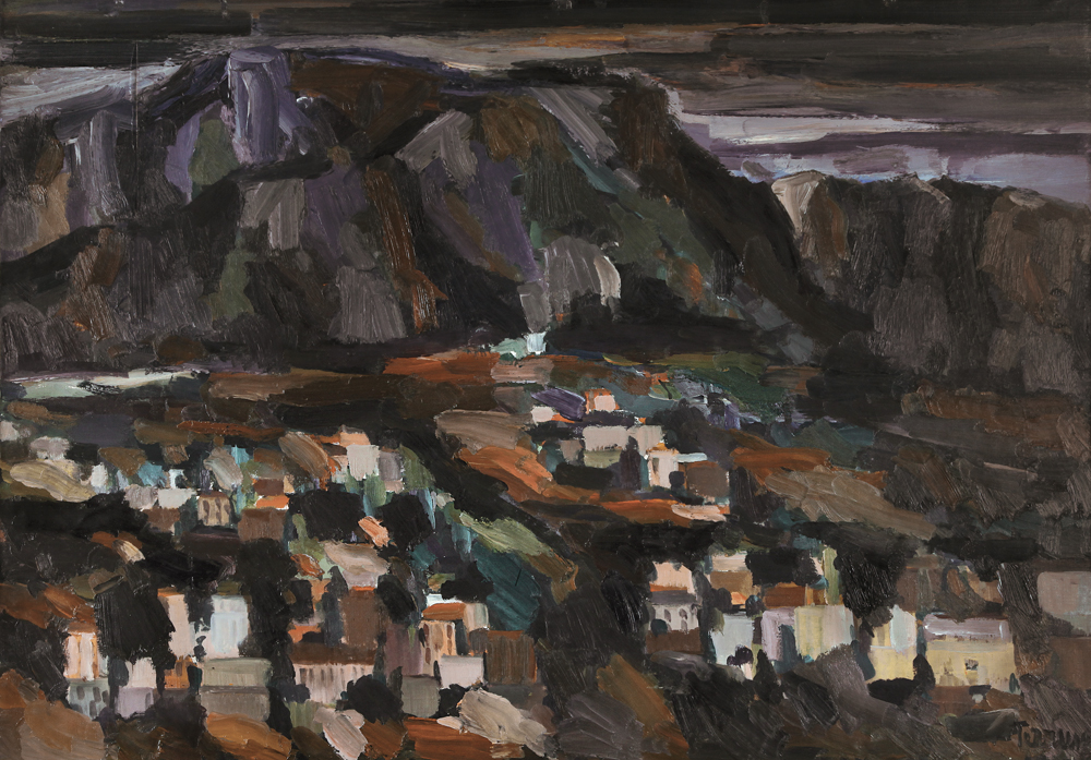 SAVERIO TERRUSO Monreale (Pa) 11/01/1939 - Milano 03/03/2003 Gardone visto da Portese olio su tela cm. 70x100, firma in basso a destra, titolo, firma ed etichetta del 5° Concorso Nazionale di Pittura Estemporanea al retro.