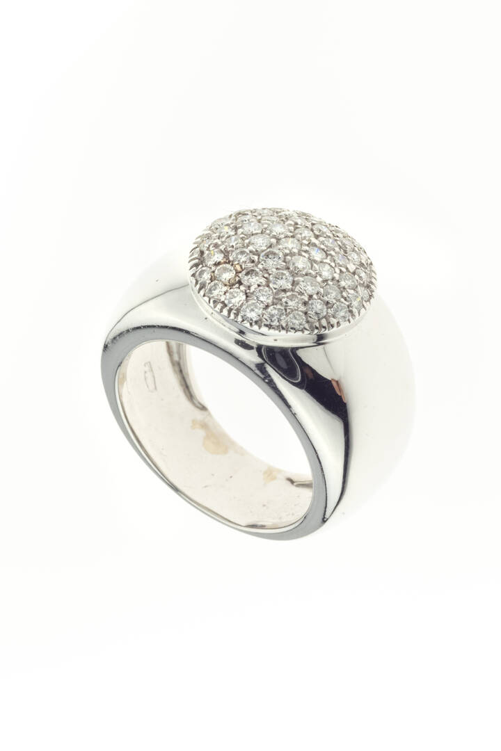 in oro bianco, a fascia, sommità con inserto rotondo in pavé di diamanti taglio brillante per totali ct 0,20 ca