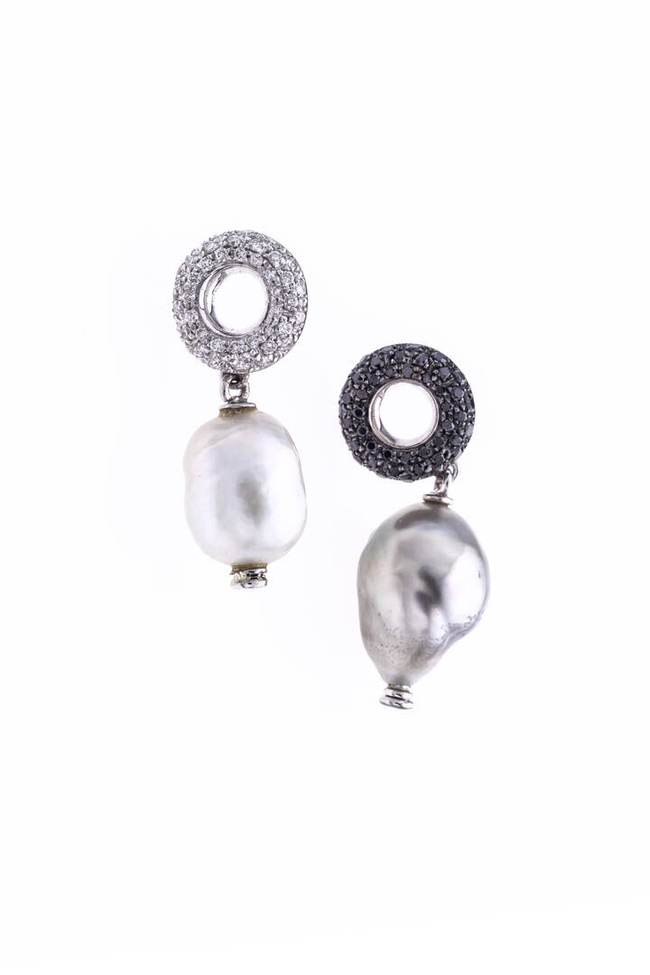 in oro bianco, dischi ai lobi, con pavé di diamanti neri e bianchi per totali ct 1,15 ca, terminanti con due perle scaramazze di diversa forma e misura