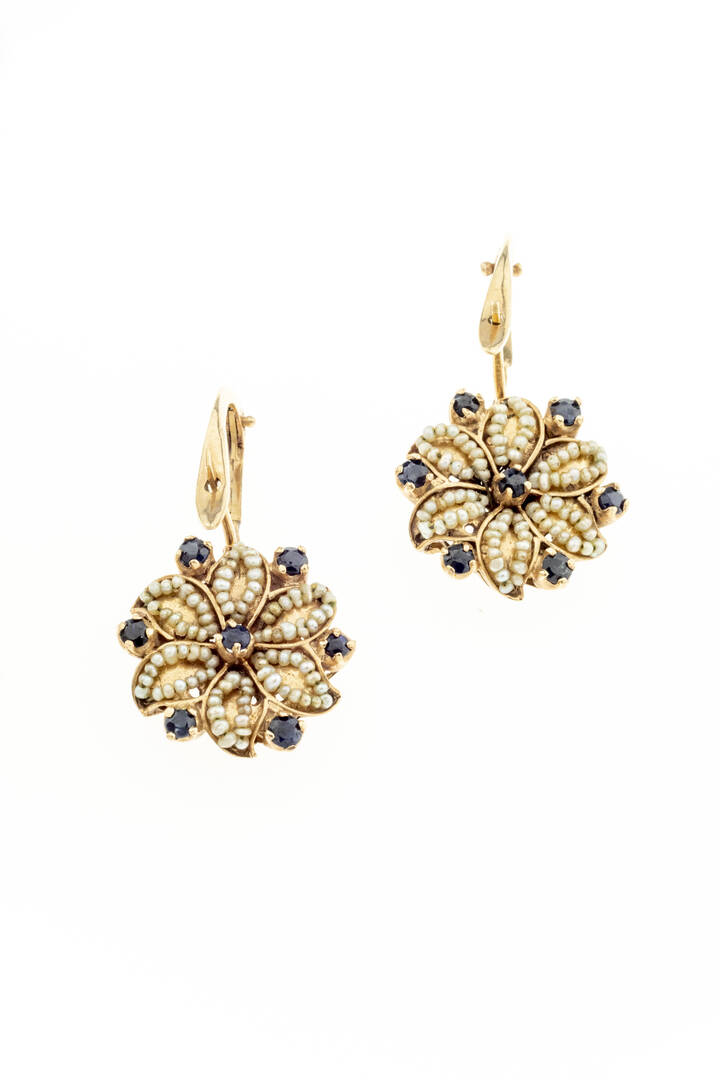 in oro giallo, a bassa caratura, a monachella, con fiori pendenti con perline e zaffiri