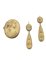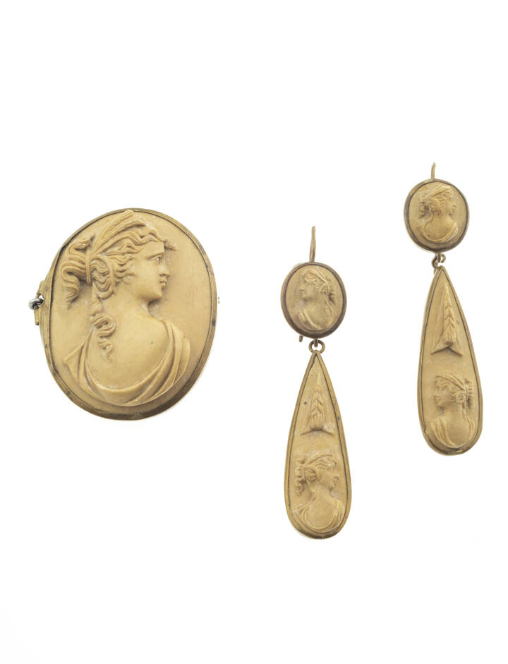 composta da spilla e coppia di orecchini in metallo dorato, XIX secolo, recante cammei in lava incici con volti femminili