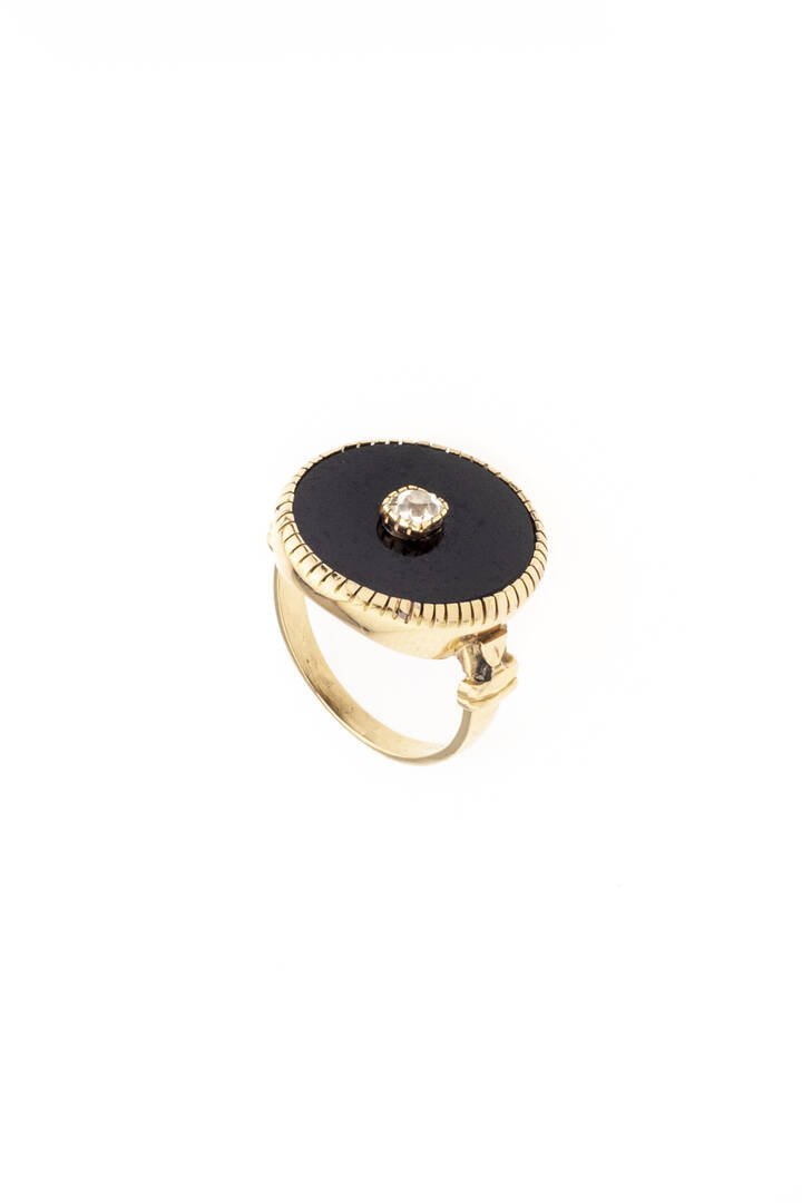 in oro giallo, a bassa caratura, sommità di forma rotonda con onice, al centro un diamantino di vecchio taglio di ct 0,20 ca