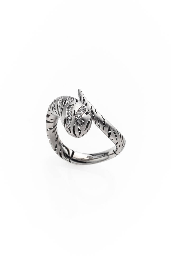 in oro bianco, sommità a serpente, corpo traforato e satinato con piccoli diamanti taglio brillante per totali ct 0,13 ca