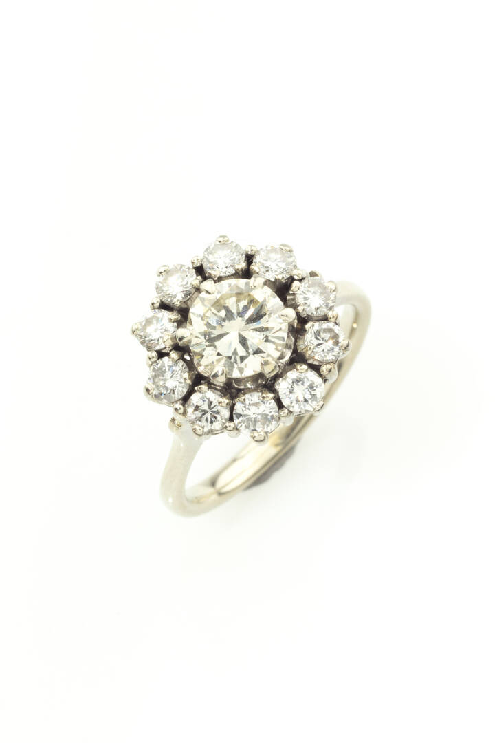 in oro bianco, sommità a margherita, con diamanti taglio brillante per totali ct 1,20 ca